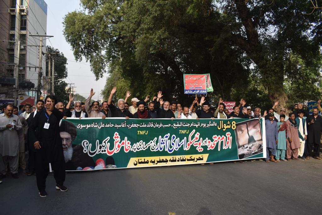 In Multan, mourning protest rally held at Press Club was led by Provincial General Secretary Qamar Hasnain Naqvi, Allama Zahid Kazmi, Mohtasham Naqvi, Baqir Naqvi and other Shia Sunni scholars and elites.