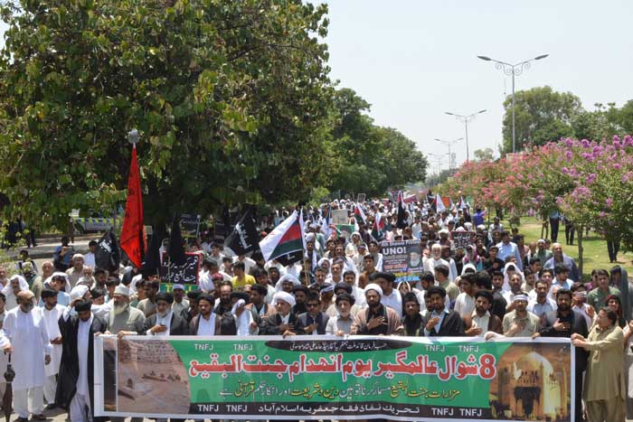 The procession expressing complete faith in the leadership of Quaid-i-Millat Jafariya Agha Syed Hamid Ali Shah Moosavi, reiterated their resolve to continue supporting his every call and offer any sacrifice for the rights of the Maktab-e-Tashih, protection of the righteous beliefs, promotion of oneness and brotherhood, and for the supremacy of the religion and the motherland. Later, the rally terminated at Imambargah Col. Maqbool Hussain after passing through its traditional route where special prayers marked the conclusion of the rally. Mukhtar Force volunteers escorted the rally throughout while District Administration had made fool-proof arrangements en route the rally. Police officers and jawans remained with the rally throughout. In Federal Capital Islamabad, the protest procession was taken out by TNFJ District Islamabad Universal Youm-e-Inhidaam Jannatul Baqee Committee from Imambargah Darbar Sakhi Mahmood Badshah. The rally was led by Ulema Karaam and religious elite belonging to different schools of thought. Addressing the rally, TNFJ Secretary General Syed Shujaat Ali Bokhari said that reconstruction of Jannatul Baqee is the issue in faith, spiritual and human in nature. He called upon the United Nation to get the dignity of Islamic Symbols restored. Allama Basharat Hussain Imami, Syed Naeem Kazmi also addressed the rally while convener of the District Jannatul Baqee Committee Raja Zulfiqar Ali thanked the participants of the rally and the administration.
