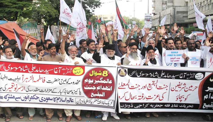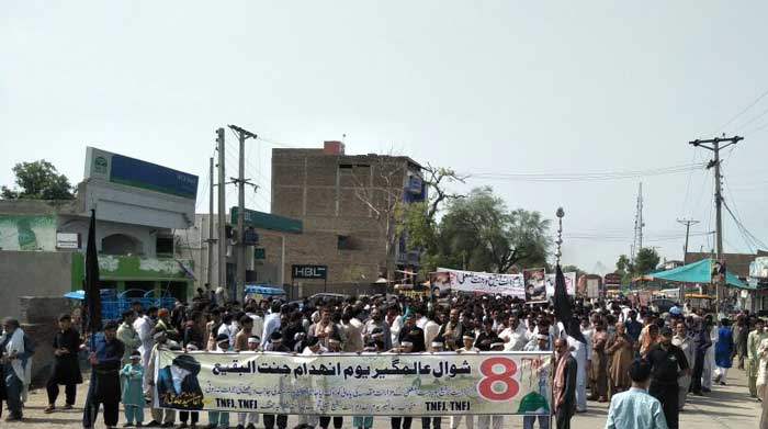 The TNFJ chief said, On the occasion of 8th Shawal, we reiterate our resolve once again that we will continue our struggle for the restoration of dignity of Islamic symbols till we are alive. Whether the black night full of oppression, hypocrisy, bestiality and savagery is so long, every passing moment is bringing that morning nearer when the oppressed will be made inheritors of this world; spring will come for the shrines of benefactors of Islam, the voices raised for the reconstruction and restoration of Jannatul Baqee and Jannatul Moallah and holy places will meet success as it is the promise of God that will be fulfilled definitely. Meanwhile, protest rallies were taken out and Majalis-e-Aza were held and protest mourning processions were taken out in all big and cities and towns on this occasion.