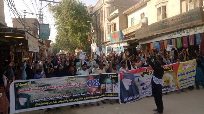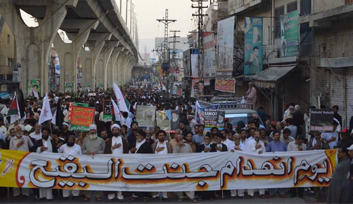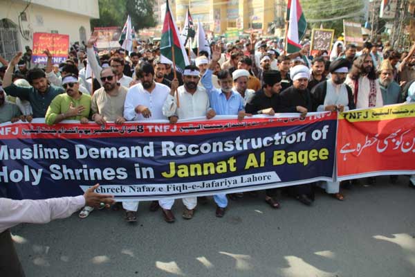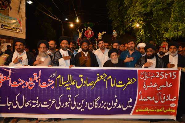 In Rawalpindi, the central Matmi protest demonstration was taken out from Imambargah Nasir Al-Aza, Murree Road. They lodged strong protest on the dilapidated condition of Jannatul Baqee while Matmi Halqas presented pursa to the Rasool-e-Khuda (SAAW) on the destruction of holy shrines of his beloved daughter Hazrat Fatima Zehra (S.A.), Ummahatul Momineen (R.A.), and Sahaba Kubaar (R.A.). The protest rally among others was led by Ulema Karam belonging to different schools of thought, office-bearers of TNFJ and other subordinate bodies, provincial, regional and district elite, leaders and Matmi Salars of religious organizations. The participants of the rally were raising slogans against the destruction of holy shrines and in favour of restoration and reconstruction of the same while hundreds of minor workers of Mukhtar Generation and youth of Ibrahim Scouts were carrying the Shabih of Jannatul Baqee and placards inscribed with different slogans. The participants of the procession marched towards Committee Chowk through marching the Murree Road performing Matamdari and Noha-Khwani where it took the shape of a grand rally. Addressing the rally, TNFJ Central Spokesman Allama Syed Qamar Haider Zaidi presented the special message of Quaid-i-Millat Jafariya Agha Syed Hamid Ali Shah Moosavi and also got approved a few resolutions while raising vociferous slogans in which they demanded restoration of dignity of the holy shrines, to declare the combined heritage of the Islamic World Makkah Mukarramah and Medinah Munawwarah as international cities, get stop oppression in Palestine, Burma and Held Kashmir, strict implementation of National Action Plan so as to wipe out terrorists completely. Operation Raddul Fasaad was also fully supported.