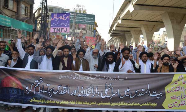 He said that the purpose of commemorating Youm ul Quds during the sacred month of Ramadan is to wake up the Muslim conscious in particular and the international conscious in general so that wounds of Muslims could be healed to some extent besides, raising voice in favor of the oppressed people of the whole world. Along with Allama Bisharat Hussani Imami, Allama Guftar Hussani Sadqi, Allama Syed Fasahat Naqvi, Maulana Meesam Gardezi, Allama Rafaqat Hussain Naqvi, Zulfiqar Ali Raja, Professor Ghulam Abbas Haidery and other leaders of TNFJ also led the rally. Later the participants of the protest rally dismissed peacefully as it reached back to the shrine of Hazrat Sakhi Mehmood Badshah. In Rawalpindi, the district Youm ul Quds Committee of TNFJ organized the central protest rally which was brought out from Imambargah Ashiq Hussain Teli Mohallah to Committee Chowk. According to the information received in the office of Alami Youm ul Quds, programs of Youm ul Quds were also held in Quetta Hazara Town, Press Club Peshawar, Darbar e Aal e Muhammad 45 Block in DG Khan, Shah Faisal Colony in Karachi, Drig Road Qasr e Zainab Bhakkar, Bargah Wali ul Asr Multan, Immabargah Adda Pasrooriyan Sialkot, Azakhana Zahra Lahore, besides the programs in Muzafarabad, Bagh, Dadu, Khairpur Meeras, Chakwal, Sargodha, Gilgit, Faisalabad, Kohat, Sheikhupura, Gujranwala, Jehlum, Deena, Qasoor, Gojra, Khanewal, Bahawalpur, Sukkur, Nawab Shah, Sehwan Shareef, Noshehro Feroz and other cities. On this occasion, complete solidarity was expressed with the courageous armed forces of Pakistan, the operation Raddul Fasaad as the voice of the nation while special prayers were offered for the resolution of problems faced by the Islamic world, and safety and progress of the motherland Pakistan besides demanding to act on all points of the National Action Plan.