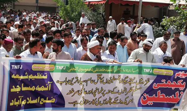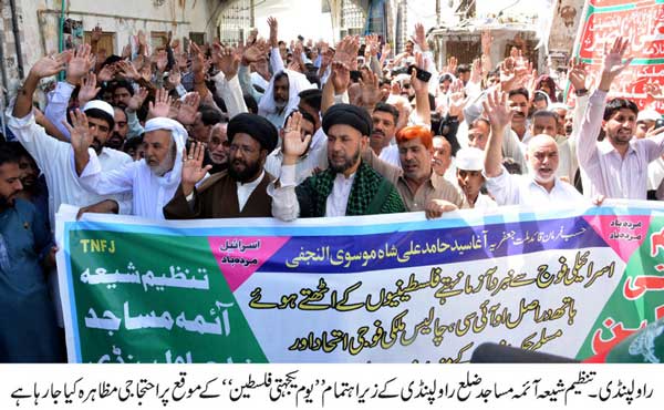 Agha Moosavi noted that Pakistan has been a supporter of freedom movements of Kashmir and Palestine since day one. The purpose of observing the day of solidarity with Palestinians is to protest against America and her stooges and to remind the international community that Pakistanis hate unjust and oppressive actions of America and stand firm in support of their Palestinian and Kashmir brothers. He said that if the chief of colonial powers, the creator of terrorist organizations, and abettor of Zionists and Hindus does not mend her ways, then no one can guarantee peace for the Middle East therefore, the chief of colonial powers must recall her decision to shift American embassy to Juresalme. Agha Syed Hamid Ali Shah Moosavi said that Pakistan is being punished for having nuclear power, supporting the oppressed Kashmiris and Palestinians and for acting as the front line state against terrorism. Agha Moosavi said that yesterdays martyrdom of the hero of Pak army Col. Suhail Abid is a great national loss as he fought agianst the conspiracy of the genocide of Patriotic Hazara tribe. If National Action Plan had been acted upon, the nation would not have seen these bad days. On the occasion of Youm e Yakjehti e Palestine, the protest rally organized in Islamabad to express solidarity with the Palestinians started from Jamea Masjid Qasr e Khadeeja tul Kubra (S.A) Federal Area, was participated by thousands of participants who were raising slogans against Israeli aggression while different resolutions strongly condemned the Zionists attrocities abetted by America and the internatinal organizations were stressed to get the issues of Palestine and Kashmir resolved in accordance with the UN resolutions that is the key to establish peace in Middle East and South Asia. Another resolution applauded courageous soldiers of Pakistans armed forces for breaking the backbone of terrorism in Pakistan and stressed upon the rulers and politicians to extend full support to Pakistans armed forces to make the opreation Raddul fasaad successful and get rid of the menace of terrorism. Meanwhile according to the reports received in TNFJs headquarter, protests and rallies to protest against Israeli aggression were held on the call of TNFJ, in Karachi, Lahore, Peshawar, Gilgit Baltistan, Muzaffarabad besides other cities and towns of the country. A rally brought out from Qasr e Abutalib in Rawalpindi was led by Allama Syed Mohsin Ali Hamdani, Allama Syed Zahid Abbas Kazmi, Syed Samar ul Hassan Naqvi, Syed Asad Abbas Hamdani and other leaders. Slogans to condemn Isralei aggression, and support the freedom movement of Palestine were raised on the occasion.
