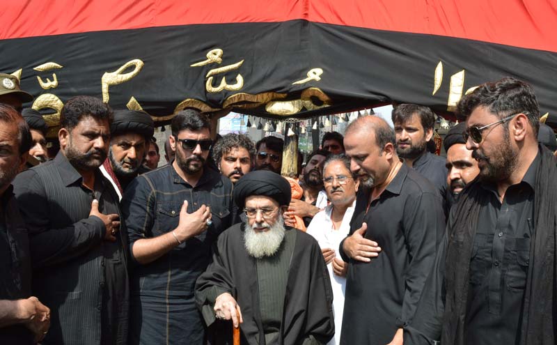 Islamabad, October 01: Youm e Ashur was commemorated on Sunday across the world including all parts of Pakistan along with Azad Kashmir and Gilgit Baltistan in the memory of the grandson of the holy Prophet (PBUH&HP) Hazrat Imam Hussain (A.S) and his 72 faithful companions with full religious respect and dignity. Central Ashura procession of Rawalpindi/Islamabad led by Quaid e Millat e Jafariya Agha Syed Hamid Ali Shah Moosavi was brought out from Imambargah Ashiq Hussain TeliMohalla which included Shabeeh e Zuljanah, Aalam e Abbas, Taaziya, Taboot and Gehwara of Shehzada Ali Asghar. On this occasion, addressing to the media and Azadars, Quaid e Millat e Jafariya Agha Syed Hamid Ali Shah Moosavi said that Yazeed wanted to alter the teachings of Islam and Shariah, he used to make fun of elhaam and Wahi (revelations), drunk openly, and was a fraud and corrupt man. After coming into power, he tried to force Imam Hussain (A.S) for pledging allegiance for himself however, Imam Hussain (A.S) refused and stated that We are the members of the holy Prophets family, angels descend in our home, Islam started and concluded in our family therefore, Hussain (A.S) brought up by the holy Prophet (PBUH&HP) himself will never submit in front of an evil doer like Yazeed. Agha Moosavi said that the grandson of the holy Prophet (PBUH&HP) Imam Hussain ibn-e-Ali (A.S) changed his plan of Hajj into Umrah to protect the sanctity and respect of Kaaba and thwarted Yazeedi plan of distorting it. He said that through his great sacrifice, Imam Hussain (A.S) not only saved but also revived the sacredness of Kaaba, greatness of the humanity and truthfulness and righteousness of Deen and Shariah for which every conscious person and follower of the holy Prophet (PBUH&HP) is thankful to Imam Hussain (A.S) and therefore, Imam Hussain (A.S) is being remembered all across the world without any discrimination of race, sect or religion. Responding to a question, Agha Moosavi declared that there is no Sunni-Shia conflict in Pakistan and sectarianism is only a name of enemys desire which will never be allowed to realize. He said that the security arrangements made for the Muharram ul Haram are worth appreciating however, representatives of banned groups must be expelled from the peace committees and Ulama boards. Agha Syed Hamid Ali Shah Moosavi said that issues related to the commutation of Zaireen across Quetta-Taftan border must be resolved on priority. He mentioned that standing against Zulm is the essence of Hussainiyat while issues faced by the all the oppressed people of the world and the Muslim Ummah can only be resolved by adopting the path of Hussainiyat.