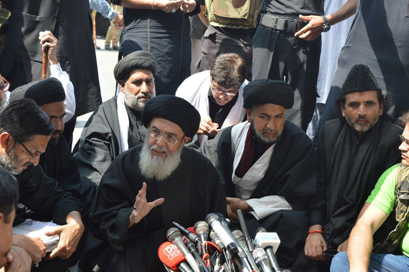 ISLAMABAD, September 29: The Patron in-Chief of Supreme Shia Ulama Board and head of Tehreek e Nifaz e Fiqah Jafariya Agha Syed Hamid Ali Shah Moosavi has said that curbs on Azadari will never be tolerated, government is responsible to provide security to the traditional and licensed Matami processions in accordance with the Moosavi-Junejo agreement of 1985 therefore, they must be brought out with complete respect and dignity. Formation of Muharram Control Rooms by the Federal interior ministry is worth appreciating, provinces must also stay connected with the TNFJs Muharram Committee Azadari Cell for the resolution of problems related to Azadars. We are Hussainis and couldnt be scared by the flags of Daesh (ISIS) however; National Action Plan must be acted upon to eliminate ISISs ideology. Not only rulers but all politicians possess soft corners for the proscribed organizations. Peace committees, ideology councils and Ulama Baords are littered with the representatives and sympathizers of banned outfits. Instead of making them a source of political bargain, the institutions formed on the name of Islamization must be filled with the true representatives of the sects. Change of opposition leader will have no impact, as people have been seeing Azlam after Zalim i.e cruel after cruel. Urs and Pursadari and Bari Imam must be restarted. . Pakistan army is not alone rather the entire nation stands behind our courageous forces in Raddul fasaad operation. Sacrifices of Pakistans armed forces in fight against terrorism are worth appreciating. He said this while addressing to a media talk held during the Central Azadari procession in G-9/4 Islamabad in the memory of the unmatchable sacrifice of the grandson of the holy Prophet Imam Hussain (A.S) his progeny and pious companions. Thousands of Azadars including dozens of Matami organizations participated in the procession. In response to a question from the media representatives, Agha Syed Hamid Ali Shah Moosavi said that getting surety bonds from the organizers of Majalis and Jaloos is unconstitutional and a violation of fundamental rights. All volunteers including Mukhtar Force and Ibrahim Scouts will fully cooperate with the administration for the security of Majalis and processions however, government must also utilize all resources and energies in this matter. He said that America who is asking to do more is the creator of all terrorist organizations who openly supported ISIS and Alqaida in Libya, Syria. Muslim conference in Riyadh presided by Trump is extremely tragic. Agha Syed Hamid Ali Shah Moosavi said that after Pakistans active role in OIC and hosting of the second OIC worried America due to which she sabotaged the then democratic government through her agent and imposed dictatorship followed by the creation of breeding grounds for the terrorists who have become the greatest challenge to the entire Muslim Ummah.