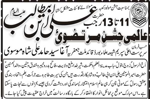 ISLAMABAD, April 20: The Patron-in-Chief of Supreme Shia Ulema Board and chief of Tehreek Nafaz Fiqh-e-Jafariyahassaid that the Islamic World is confronting decline and anarchy owing to keeping away from ideologically and practically from Madina and Najaf. Their act in getting rid of knowledge has made them beggars of the west. The Muslim Ummah may hold the Daman of the Door of MadinatulIlm (SAAW) i.e. Ali Ibne Abi Talib (A.S.) that is the certificate of success against the Abu Jehals of today and a source of survival in the Hereafter. The fatality of every terrorist and oppressor of the world lay in the Zarb-e-Haideri and the punishment of every corrupt and oppressive is the Adl-e-Murtazvi. Maula-e-Kainaat Ali IbneAbiTalib (A.S.) was great personality and was a masterpiece of the Nature. The honours like being born in Kaaba and martyrdom in the mosque are such that no other person enjoys. His Wilayat was made obligatory for every Kalma-uttering person through this saying of the Nabi (SAAW) that Ali (A.S.) is the Maula of all those, I Nabi (SAAW) is the Maula of whom, Ali is the Peshwa of all Aulia. These views were expressed by him in a message delivered on the occasion of Jashan Maulood-e-Kaaba marking the WildatPurnoor of the Maula-e-Kainaat Hazrat Ali IbneAbiTalib (A.S.) that is being observed throughout the country on Thursday Rajab 13 with devotion and respect. Agha Moosavi said Hazrat Ali (A.S.) was born pious and pure and his forehead never bowed down before any idol that is why his name carries the words Karam Allah Wajho. Ali IbneAbiTalib (A.S.) did not open his eyes unless he was given in the lap of Rasool (SAAW) who fed him his saliva and then he remained along with the Nabi (SAAW) till his Wisaal emerging successful in every test of the time. He said he inherited the love for Rasool (SAAW) from his father Hazrat Abu Talib (A.S.). Like Nabis (SAAW) kafalah was taken over by Hazrat Abu Talib (A.S.), similarly the responsibility of Ali IbneAbiTalibs (A.S.) kafalah was taken over by the Rehmatul Lil Alimeen (SAAW) and UmmulMomineenMalikatul Arab Hazrat Khadijatul Kubra (S.A.). The TNFJ chief said that Hazrat Ali (A.S.) says, Rasool-e-Khuda (SAAW) used to keep pinned down me with his chest, used to keep me with him in bed, keep me having his smell, used to crush eatables in his own mouth first and then feed me the same. I used to follow the Nabi Kareem (SAAW) in a manner like the baby camel used to follow his mother camel. He said that is why Rasool (SAAW) always designated important responsibilities to Hazrat Ali (A.S.) whether it is DawahZulAsheera, whether the announcement of his Wilayat at Ghadeer-e-Khum and whether it is any other important occasion and Ghazwa. Agha Moosavi had once said that, Ilm-e-Qazahas been divided into ten parts; nine parts have been awarded to Ali (A.S.) and tenth has been distributed among the whole world. He said the Khalifa-II Hazrat Omar IbneKhatab (R.A.) during his khalifate period used to consult Maula-e-Kainaat Hazrat Ali IbneAbiTalib (A.S.) in all difficult matters considering him the solid source of knowledge and that is why he had once said, Allah may not keep Omar (R.A.) in a situation where Ali (A.S.) is not there to resolve it. The Quaid-i-MillatJafariya Agha Syed Hamid Ali Shah Moosavi himself had stated that by God there is no Ayah that is sent about which I am not aware that where and in which connection it was sent. He had also said that if I like to write the Tafseer of Surah Fatiha it would become equal to 70 camels. Agha Moosavi prayed that may Allah give courage to the Muslim Ummah to keep them attached with Daman of Mustafa (SAAW) and Murtaza (A.S.).