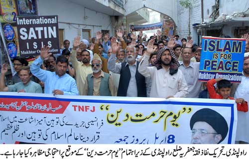 ISLAMABAD, April 8: On the call of Patron-in-Chief of Supreme Shia Ulema Board and chief of Tehreek Nafaz Fiqh-e-Jafariya, Friday was observed as Youm e Hurmat e Din against the blasphemous sketches against Muslims and Islam published in French magazine, throughout the country with religious zeal and respect. On this occasion against this mischievous act of the French magazine Charlie Hebdo peaceful protest were carried out throughout the country including capital city Islamabad. While addressing on the occasion Quaid e Milat e Jafariya Agha Syed Hamid Ali Moosavi also announced 1st of Rajab as Youm e Baqir Ul Uloom. He said that its because of the stupid policies of the Muslim Leaders that international imperialist powers are into such mischievous acts and making fun of the signs attributed to Allah and the glory of Islam. He said that just after one week of Brussels terrorism incident, this blasphemous act of French Magazine Charlie Hebdo was neither criticized by any Muslim ruler of politician nor it was highlighted by media, although media keep highlighting every single thing and keeping holding long debates on political issues yet this act of anti-Islamic movement was not even discussed. Quaid e Milat e Jafariya Agha Syed Hamid Ali Moosavi said that the pledge to fail all the conspiracies against Pakistan and to make it peaceful and prosperous country in the meeting of Core-commandersis the voice of the whole nation, because without failing the domestic and internal enemies, foreign enemies cannot be competed. He said that governments attitude even after arresting a key agent of RAW and not highlighting this issue on international media and platforms even after having sufficient evidences is quite suspicious.