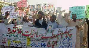 In federal capital Islamabad, a peaceful protest rally, organized by TNFJ local council, was staged in front of United Nations office, Saudi Pak Tower. Scholars and religious leaders belonging to different schools of thought were leading the demonstration. Holding placards and protest banners, the participants were chanting slogans in condemnation of the incidents that occurred on March 2 in Karbala, Kazmain, Quetta, Phalia and then in Haideri Mosque Karachi incident that took place on May 7. Some of the banners and placards read: Ashoura Day attacks caused humanity to quiver, Lesson is from Karbala, fear is of Allah alone, Martyrs blood wont let go waste, Karbala, Kazmain, Quetta, Phalia naked terrorism, Iraq jail abuse black scar on humanity, ICC take notice of Iraq abuse, Quit Bush, Blair on Iraqi abuse, UN! Make coalition out from Iraq, UN! Ensure Maraje Protection, UN must get restore honor of Iraq holy sites, Even beasts protect their species, Iraq abuse Satanism, and US refreshed memory of Pharaoh, Nimrod, Yazid. The protest leaders presented a protest memorandum in the office of UN. The memorandum severely condemned atrocities of colonial powers being carried out against oppressed nations and Islamic world and expressed grave concern that no part of the world is spared of Taghooti aggression in one form or the other upsetting the peace and tranquility of the whole world. Kashmir and Palestine are under the Taghooti clutches for more than a half century, Afghanistan has been targeted in the name of Osama and turned into Khofistan but Osama could not found even then, Iraqi people were targeted in the name of Saddam and in the garb of unearthing weapons of mass destruction. After that, a new history of oppression and brutality was written by abusing the Iraqi prisoners at Abu Gharib Jail and other detention centers to the extent that whole humanity quivered, the pictures issued of these brutal acts unveiled the so-called claims of America and her allies viz. independence, freedom and human rights.