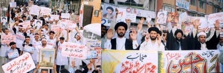 Today the international opinion is protesting against US President Bush for inhuman oppression, and America and her allies were forced to beg pardon but despite that America was still following the non-cooperative policy and is using all types of tactics to maintain her interests and supremacy of her agents in Middle East and South Asia, biases are being promoted, seeds of hatred are being sown but the US has seen that every where only defeat is her fate. The memorandum said that for getting rid of risks and success and correction of humanity it is necessary that practical struggle by following the righteous path should be accelerate and the problems of all oppressed and have-nots should be considered as problems and difficulties of us all. It further said that Islam always condemned aggression and adopted defensive strategy. Condemning the oppression and brutality of the allied forces, resolve to fully support the struggle of the oppressed world was reiterated. It demanded from all international organizations including the United Nations, particularly the International Court of Justice to take notice of these brutalities if they care for the protection of human dignity and justice and fair-play, put all oppressors including the American President Bush and his allies Tony Blair, Sharon and chiefs of their armies into the trial box, arrange pull out of allied forces from occupied States. If this was not done, he said, then oppressed nations and the Islamic World would be justified to understand that all oppressions being carried out the world over are being carried out under the umbrella and patronage of international organizations. The memorandum urged the international organizations to ensure the honor and dignity of the holy places on the Iraqi soil. Keeping peace in the occupied area is the responsibility of the occupation forces but the allied forces interfered themselves and committed desecration and aggression against holy places that is condemnable. It demanded to ensure the honor, dignity of the holy places, Maraje Uzzam, Hoza Ilmia, and life and wealth of the people. Later, the protestors dispersed peacefully by chanting zealous slogans.