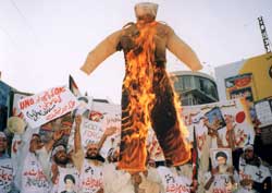 Religious scholars from different mosques of Rawalpindi Allama Mohsin Ali Hamdani, Allama Hussain Moqaddesi, Allama Basharat Hussain Imami, Allama Matloob Taqi, Allama Qamar Abbas Kazmi, Allama Zawwar Hussain Madni, Allama Zahid Abbas Kazmi, Allama Mazhar Hussain Naqvi, Allama Mujtaba Hussain Bukhari, Allama Waqar Naqvi, TNFJ additional secretary general Syed Shujaat Ali Bukhari, MSO chairman Bu-Ali Mehdi, MFP Guardian Council chairman Ch. Abu-Bedar Ali, Central convener Youm-ul-Huzn M.H.Jafri, MSO central president Haider Abbas Bajwah, MSO secretary general Mohibb-e-Ali Naqvi, district president Ali Furqan Jafri, TNFJ district president Alhaj Ghulam Murtaza Chuhan, general secretary Mazloom Hussain Shah, Ibn-e-Ali Kazmi, Haider-e-Karrar Moosavi, Meesam Tammar, Abu-Nasr Kazmi, Aqeel Naqvi and other leaders were leading the rally. Holding banners and placards inscribed with anti-US statements, the protestors were chanting slogans: Labbaik Ya Hussain, lesson is from Karbala fear is of Allah, Death to America, coalition! Out from Iraq and Al-Jihad Al-Jihad Labbaik Labbaik. Reaching committee chowk, the Shroud-Wearing protest rally assumed the shape of a protest meeting, where TNFJ Central Secretary Information Syed Qamar Haider Zaidi in his address termed sacrilege of Iraq holy sites as an open challenge for the honour of Islamic world. He demanded from International Court of Justice to form an Enquiry Commission taking suo moto notice of bombardment on Caliph of Muslims Hazrat Ali ibn-e-Abi Talib (peace be upon them), causing harm to the shrine, siege of Karbala Moalla and massacre of oppressed Iraqi people, and give severe punishment to the perpetrators of sacrilege of holy sites, which are revered in the sight of whole humanity, by making them stand in the court. Allama Abu-Jafar Naqvi, President TNFJ Punjab also addressed the protestors. He demanded effective role of international organizations including UN in ensuring safety of holy places, Hawzaat Ilmiya and Iraqi people as well as in withdrawal of coalition forces. Effigy of US president Bush was torched by the protestors at the end of the protest. Later they dispersed peacefully. Allama Sheikh Ghulam Askari, Allama Mohsin Ali Hamdani and S. Sabzawari addressed a majlis-e-aza at Qasr-e-Abu Talib, organized by Anjuman Ghulaman-e-Abu Talib. Annual Youm-ul-Huzn majlis organized by Syed Moazzam Ali Rizvi at Qadeemi Imambargah was addressed by Allama Naseem Abbas Rizvi, Allama Agha Ali Hussain Najafi, Khateeb Fateh Furat, Syed Maddah Hussain, Hafiz Prof Tasadduq Hussain, Aqeel Mohsin Naqvi, Zakir Jafar-e-Tayyar and Zakir Syed Ali Raza Shah.