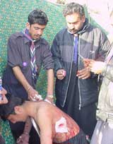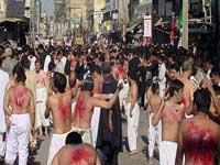 In Rawalpindi, participants of the main procession that was taken out from the residence of late Bawa Syed Karam Hussain Shah performed great zanjirzani at Chuhr Chowk. Matmi corps from across the division participated in noha khwani and matam dari.