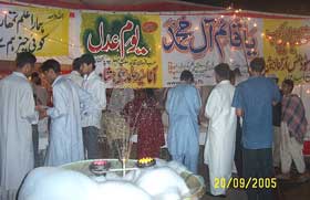 Syed Baqir Hussain Naqvi, Central President MSO Pakistan also addressed the gathering. Various Qaseeda Khwans presented poetic homage in Bargah-e-Imam Zamana (A.S.). Later 110-pound cake brought by MSO Karachi Company Unit was cut. Dozens of groups reciting Qasaed reached the bank of Rawal Lake from Qasr-e-Abu Talib Rawalpindi Cantt, Imambargah Nasir Al-Aza, Darbar Sakhi Shah Piyara Chuhr Harpal, Chittian Hattian, Khayaban-e-Sir Syed, Tarlai Kalan, Ali Masjid G-7, Dhoke Ratta, Dhoke Syedan, Saddar, Mohallah Imambara, Satellite Town, Hussainabad, Pind Sangarial, Shah Allah Ditta, Shahzad Town, Dhoke Ali Akbar and other places. Allama Basharat Hussain Imami recited collective Dua for consigning Areeza jaat to water and thousands of devotees presented their araez in the respected court of Imam-ul Asr (A.S.).