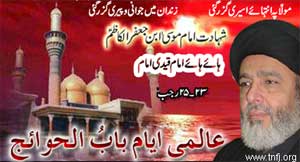 Thousands of participants on this occasion, through a resolution presented by Nazim-e-Majlis Syed Nasim-us-Saqlain Kazmi resolved to support any line of action given by Quaid-i-Millat Jafariya Agha Syed Hamid Ali Shah Moosavi for promotion of Wila and Aza and achievement of religious rights. Taboot Babul Hawaij procession was also taken out on this occasion. Various Ulema and Zakireen addressed the Majlis-e-Shahadat Imam Musa Kazim (A.S.) organised at Qasr-e-Abu Talib under the auspices of Kazmi Brothers. A Taboot procession was taken out from the residence of M.H. Jafri that was terminated at Qasr-e-Abu Talib. A Majlis-e-Aza was held at Mughalabad under the auspices of Syed Wajid Hussain Shah which was addressed by various Ulema and Zakireen. Majalis-e-Shahadat Babul Hawaij (A.S.) following by Taboot processions and Matamdari were held at Qasr-e-Khadijatul Kubra Islamabad, Markazi Imambargah G-6/2, Masjid-e-Jafariya I-9 while a similar programme was organised by Anjuman Faiz-e-Punjtan (Women Wing) at Imambargah Zainul Abideen Satellite Town. Meanwhile, according to reports reaching the offices of International Ayyam Babul Hawaij Committee of the TNFJ, Majalis-e-Aza were held and Taboot processions were taken out in Peshawar, Kohat, Attock, Lahore, Quetta, Muzaffarabad, Gilgit, Faisalabad, Dera Ismail Khan, Bhakkar, Layyah, Dera Ghazi Khan, Multan, Sheikhupura, Sialkot, Syed Kasraan, Gujrat, Sukkur, Hyderabad, Chakwal, Gujranwala, Gujjar Khan, Karachi, and other cities.