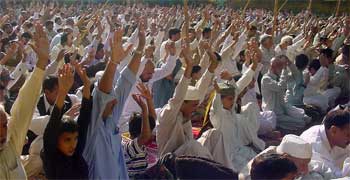 The resolution stressed the need that the whole Muslim Ummah should accept the leadership of Pakistan for achieving all occupied Muslim areas including Al-Quds Al-Sharif, independence of Kashmir and Palestine and for solution of all problems faced by the Islamic World because Pakistan is an atomic power today by the Grace of God and was created on the basis of Nazria-e-Asaasi. The resolution called upon the powers that be and the opposition to adopt the policy of mutual understanding, bury the politics of vendetta and adopt singular thinking and morality so as to achieve an end to the politics of chaos and anarchy. Another resolution strongly condemning all types of terrorism including the bomb blast at Dargah Khwaja Moeen ud din Chishti Ajmeri reiterated the point of view often expressed by Quaid-i-Millat Agha Syed Hamid Ali Shah Moosavi that a terrorist keeps no religion, Maslak or a country, he is only a terrorist.