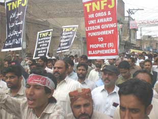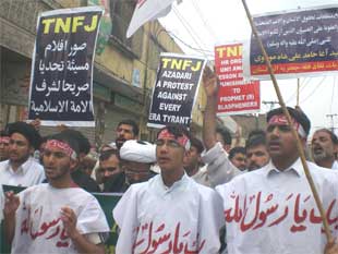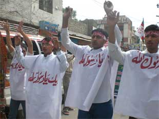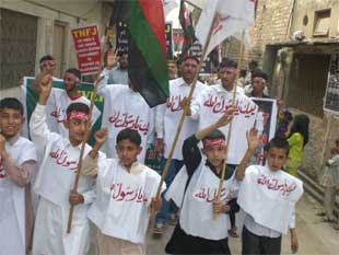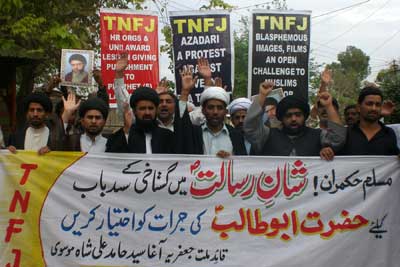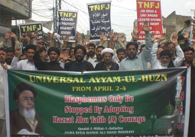 Resolutions were adopted against blasphemers during majalis-e-aza and protest mourning processions of Taboot (replica coffin). A demonstration was staged in G-9/4 under arrangements of TNFJ Capital City Islamabad led by Allama Ikhlaq Hussain Kazmi, Mufti Bassem Abbas Zahiri, Maulana Malik Ijlal Haider Al-Haideri, Maulana Arif Hussain Naqvi, Maulana Kazim Abbas Kazimi and other ulema-e-karam. A resolution adopted on this occasion termed heinous activities like blasphemous images of holy Prophet (SAWW), anti-Islam film and dramas a well-planned ugly conspiracy of West against the world of Islam. It urged Muslim rulers to raise this issue at UN forum giving proof of national and religious honor besides adopting solid strategy to stop this Iblisi storm.