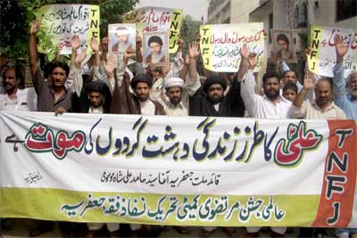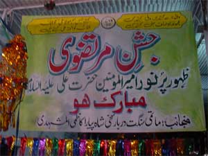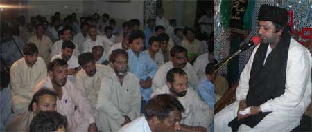 The speakers in their address made it clear that the life-style of Amirul Momineen Hazrat Ali (A.S.) is death for terrorists. Dr. Rizvi said the name of Ali (A.S.) guarantees rooting out of oppression. He said the seerat and teachings of Ali Ibne Abi Talib (A.S.) are the source of encouragement for the oppressed. A resolution adopted on the occasion termed the humiliation of Amirul Momineen Hazrat Ali Ibne Abi Talib (A.S.) after blasphemy a colonial conspiracy and called upon the comity of nations in general, and Muslim States and the OIC in particular to formulate comprehensive policy to check such activities. Another resolution made it clear that at present Pakistan was the biggest target of colonial powers and the increasing incidents of terrorism and activities of America and her allies provide food for thought for the patriotic forces. Therefore, it said, all those powers that love Islam and Pakistan should forget their personal, party, regional, ethnic differences and adopt a joint and agreed policy for the protection of the religion and the motherland. The resolution strongly condemned bombing of Nato forces in the frontier region and continued incidents of terrorism in the sensitive areas of the NWFP. The participants of the demonstration reiterated their resolve to offer any sacrifice for the honour and dignity of the motherland. Allama Syed Qamar Haider Zaidi addressing the main function of the International Jashan-e-Murtazvi organised by Hayat Tulaba-e-Islamia at Aza Khana Masooma-e-Qum in Rawalpindi said that seerat and character of Amirul Momineen Ali Ibne Abi Talib (A.S.) is the beacon of light for the whole humanity and Alis (A.S.) life-style is the life of justice and fair-play and death of the oppression. He said as per a saying of Allama Ibne Hajr Asqalani, after Nabi (SAAW) none but only Hazrat Ali (A.S.) has the honour of not bowing down before any Ghair Allah, that is why he was given the title of Karam Allah Wajho. He said if the world of humanity desires to get rid of Taghoot and Jabroot then they would have to bow down before Dar-e-Haider Karrar (A.S.). There is a saying of the Paighambar-e-Islam (SAAW) that Ali (A.S.) is with Quran and Quran is with Ali (A.S.). That means if you do not understand Quran then ask Ali (A.S.) and if you do not understand Ali (A.S.) then you may take guidance from Quran. Mufti Basim Abbas Zahiri, Maulana Arif Al-Hussaini, Ch. Mushtaq Hussain, Syed Nazir Hussain Shah, Bawa Khadim Hussain, Riwayat Hussain Ravi, Mohsin Bilali, Haider Awan, Malik Qasim, Ali Zeb Kazmi and others also addressed the gathering. Syed Jone Ali Mashadi performed as stage secretary while Muhammad Jafar Khan recited from the Holy Quran. A Mehfil-e-Murtazvi was held under the auspices of Matmi Dasta Sakhi Shah Piyara Kazmi Al-Mashadi at Darbar-e-Aalia. Allama Nasir Abbas Multan, Allama Syed Matloob Hussain Taqi, Zakir Zuriyyat Imran Shirazi, Maulana Ijlal Haider Al-Haideri, Zakir Shaukat Hayat Nayar, Zakir Safdar Hussain Saqi, Khateeb Shahzada Ali Asghar, Syed Aun Abbas Kazmi, Zakir Sagheer Hussain Kazmi, and others addressed. A similar gathering was organised at Qasr-e-Zahra under the auspices of MSO Shahpur, Taxila. Mualana Syed Yousuf Hussain Shah, Syed Qasid Hussain Shah, Nabil Haider, Maulana Zahoor Haider Shah, Tahir Hussain Shah, and Syed Zakir Abbas addressed. A Mehfil-e-Milad was also held at Imambargah Zainul Abideen under the auspices of Anjuman Faiz-e-Punjtan (Women Wing). Meanwhile, according to reports reaching the office of the International Jashan-e-Murtazvi Committee of the TNFJ, Jashan-e-Murtazvi programmes were also organised in Peshawar, Kohat, Attock, Lahore, Quetta, Muzaffarabad, Gilgit, Faisalabad, Dera Ismail Khan, Bhakkar, Layyah, Dera Ghazi Khan, Multan, Sheikhupura, Gujrat, Sukkur, Hyderabad, Chakwal, Gujranwala, Gujjar Khan, Karachi and other cities. Prays were sought for the supremacy of the Islamic World, protection and stability of Pakistan, success of all Islamic and independence movements including that of Kashmir and Palestine, rooting out of terrorism and unity and mutual understanding between the Muslim Ummah in these programmes.