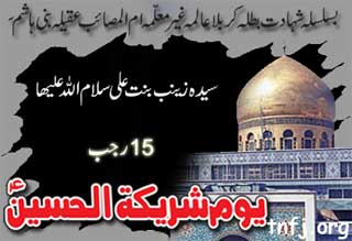 RAWALPINDI, July 18: The Quaid-i-Millat-i-Jafariya Agha Syed Hamid Ali Shah Moosavi has said that the satanic world could be defeated by following the Sabr-e-Zainabi. This was stated by him while announcing to observe Youm-e-Sharikatul Hussain (A.S.) on 15th of Rajabul Murajjab marking the Shahadat (martyrdom anniversary) of Nawasi-e-Rasool (grand daughter of Prophet) Dukhtar-e-Ali (A.S.) and Batool (S.A.) Hazrat Zainab (S.A.). He said Hazrat Zainab Binte Ali (S.A.) fulfilled the most important responsibility of Tauheed, Risalat and Wilayat in a manner that made the Karbala Tragedy eternal till the D-Day. Agha Moosavi said that Binte Ali (A.S.) and Batool (S.A.) not only diverted the history through her addresses but also shattered the Yazidi courts. Zainab Binte Ali (S.A.) is that brave woman who bore all difficulties but did not allow anyone to cause any harm to the religions dignity. Her voice would echo in the streets of Kufa and Shaam and in the courts of Ibne Ziad and Yazid and would be a source of strength for the oppressed world all around, he added. He said the oppressed people of Kashmir, Afghanistan and Iraq are confronting the Yazidan-e-Asr being encouraged by the commitment and resolve of Hazrat Zainab (S.A.). He said Zainab-e-Kubra (S.A.) achieved knowledge from the Mustafvi and Alvi Maktab and was brought up in the lap of Zuhd-o-Taqwa and took her share in plenty viz. honour and supremacy. The Quaid-i-Millat-i-Jafariya Agha Moosavi said that Fazail and Munaqib of Hazrat Zainab Binte Ali (S.A.) are the source of encouragement for women at large. The character of Zainab (S.A.) is the symbol of dignity and honour for women at large. He said our Darood-o-Salam for Hazrat Zainab (S.A.) who shattered the oppressive courts through her oratory. He appealed the followers of Muhammad (SAAW) and Aal-e-Muhammad (A.S.) to express their solidarity with the oppressed world and hatred against the oppressive and brutal forces on the tragic occasion of Youm Sharikatul Hussain. Meanwhile, Central Youm Sharikatul Hussain Committee of the TNFJ has been formed to formulate the programmes for Youm Sharikatul Hussain. S. Zaman has been named Convener and Malik Ijlal Haider Al-Haideri as Secretary of this Committee.