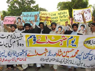 Peaceful demonstrations were staged in different cities including Rawalpindi against humiliation of Mashaheer-e-Islam, attacks of Nato forces in Pakistans frontier region and incidents of terrorism in other places. Dr. S.M. Rizvi, Convener of the International Jashan-e-Murtazvi, and ulema led a peaceful demonstration. The demonstrators were carrying different banners and placards and portraits of Quaid-i-Millat-i-Jafariya Agha Syed Hamid Ali Shah Moosavi.
