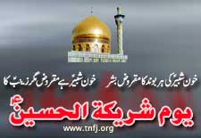 A resolution adopted on the occasion expressed grave concern that some unseen forces were trying to destabilise the motherland therefore all sections of society including the government and the opposition were under the obligation to thwart this heinous conspiracy jointly. The resolution condemned the violation of Pakistani frontiers by Nato forces and called upon the government to raise this issue at the United Nations. The resolution termed the accusation levelled against Pakistan by Karzai as a bid to please the satanic forces. The resolution demanded that Kashmir and Palestine issues may be resolved in line with the United Nations Resolutions and exit of allied forces from Afghanistan and Iraq may be ensured. Another resolution expressing concern over the renewed activities of banned organisations in the country called upon the government and the opposition to keep away from the banned groups. Khateeba-e-Ahle Nabi Syeda Binte Ali Moosavi addressed a Majlis-e-Aza organised at Sheb-e-Abi Talib under the auspices of Anjuman Kaneezan-e-Imam Al-Asr Waz Zaman. Mufti Basim Abbas Zahiri addressed a Majlis-e-Aza oganised by Hayat Tulaba-e-Islamia at Aza Khana Masooma-e-Qum. Allama Basharat Hussain Imami addressed a similar gathering organised at Markazi Imambargah Qasr-e-Khadijatul Kubra Tarlai Kalan Islamabad under the auspices of Youm Sharikatul Hussain District Committee of the TNFJ. Allama Hussain Muqaddasi addressed Youm Sharikatul Hussain Majlis at Imambargah Ahle Bait Wah Cantt., Allama Mohsin Ali Hamdani at Qasr-e-Abu Talib, Allama Akhlaq Hussain Kazmi at Imambargah Qasr-e-Imam Musa Kazim Sadaat Colony, Allama Syed Matloob Hussain Taqi at Markazi Imambargah Sakhi Shah Piyara Chaur Harpal, and Allama Syed Fakhar Abbas Abidi addressed Youm Sharikatul Hussain Majlis at Imambargah Dehlaliah.