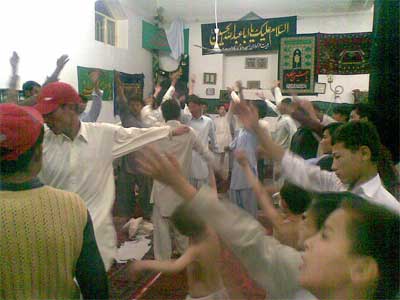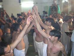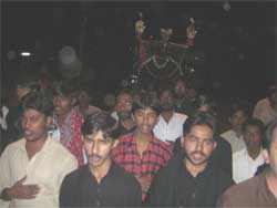 The Taboot procession terminated at Imambargah Zainul Abideen. Ealier, Allama Syed Qamar Haider Zaidi addressed the Majlis prior to the Taboot procession. Allama Shaikh Ijaz Hussain, Ch. Mushtaq Hussain, Mufti Basim Zahiri, Nazir Hussain Shah and others also address the Majlis. A resolution adopted on the occasion called upon the international organisations to get the holy shrines destruction by Aal-e-Saud reconstructed. Another resolution strongly condemned the violations of the Pakistani frontiers and made it clear that the whole nation is ready to offer any sacrifice should to shoulder with the Pakistans armed forces.