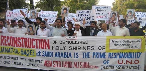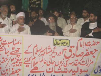 In their address in Friday congregations, speakers highlighted the seerat of Sadiq Aal-e-Muhammad (A.S.) and declared that getting the honour and dignity of their shrines is the combined duty of the Islamic World. In Islamabad, Central President of Mukhtar Organisation Syed Wajihul Hassan Kazmi, Vice-President Ajmal Hassan Naqvi, Secretary General Haider Abbas Bajwa, Secretary Tanzeem Syed Mehdi Al-Hussaini, Secretary Azadari Muhammad Abbas Baloch, Secretary Taleem-o-Tarbiyyat Qazi Wafa Abbas, Deputy Office Secretary Syed Mustansar Hussain Naqvi, Syed Mazahir Imran Kazmi, Syed Azmat Hussain Naqvi, Irfan Bangash, Babar Suhail and others led the protest demonstration organised in front of the Press Club Camp Office.