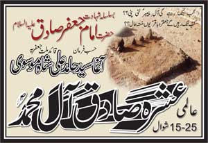 ISLAMABAD, October 19: The Ashra-e-Sadiq-e-Aal-e-Muhammad Majalis and Matmi processions continued throughout the country on Monday to observe the Shahadat of Hazrat Jafar Ibne Muhammad As-Sadiq (A.S.) on the call of Quaid-i-Millat-i-Jafariya Agha Syed Hamid Ali Shah Moosavi. Ulema, waizeen and zakireen addressing Majalis-e-Aza organised by different religious and Matmi organisations in Federal Capital Islamabad, Rawalpindi Region and all the four provinces including Azad Kashmir and Northern Areas highlighted the seerat of Imam Sadiq (A.S.) in detail. Khateeba Aal-e-Aba Syeda Bint-ul-Huda addressing a Majlis-e-Aza organised by Anjuman Dukhtran-e-Islam, Ummul Baneen WF, Sakina Generation and Girl Guides said that Imam Jafar-e-Sadiq (A.S.) was the great personality of Ahle Bait (A.S.) and was laced with different Uloom. She said that he used to disseminate knowledge and meanings of Quran and it was Sadiq Aal-e-Muhammad (A.S.) who displayed heights of knowledge. She said that practically following the teachings of Imam Jafar-e-Sadiq (A.S.) is the need of the hour in getting the world rid of all types of difficulties and problems because the whole humanity was upset on the present worst condition of the international situation. She said that Hazrat Jafar Ibne Muhammad (A.S.) performed plenty of services in disseminating Uloom-e-Illahi. He was not desirous of ruling any State rather he spent his days and nights in worship. She said Imam Jafar-e-Sadiq (A.S.) is the real basis for Risalats essence and he played his basic role in disseminating and promoting Shariat-e-Muhammadi on the basis of which the message of Islam reached all religions the world over in its true spirit apprising them of Maarfat-e-Tauheed. Zakira Abeela Kazmi also addressed the Majlis that followed bringing out of Taboot Sadiq Aal-e-Muhammad (A.S.) and Matamdari. Allama Syed Abul Hassan Taqi, TNFJ Regional Council Rawalpindi President addressing a Majlis at Imambargah Sakhi Shah Piyara Kazmi Al-Mashadi Chaur Harpal said Imam Jafar-e-Sadiq (A.S.) was the scholar of Ilm-e-Ladunni and a large number of wise persons benefited from it. He said Imam Abu Hanifa remained a pupil of Hazrat Jafar-e-Sadiq (A.S.) for a long time and achieved laurels.