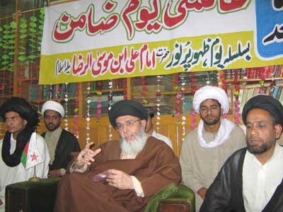 RAWALPINDI, November 10: The Quaid-i-Millat Jafariya Agha Syed Hamid Ali Shah Moosavi has said that practically following the Asswah of Hazrat Imam Ali Raza (A.S.) to get the humanity rid of defame and humiliation was the need of the hour. He stated this while addressing a special function of International Youm-e-Zamin at Aza Khana Masooma-e-Qum on the auspicious occasion of Wiladat-e-Purnoor of Imam Ali Bin Musa Al-Raza (A.S.). He said the personality of any human being could not be gauged from his face, outlook or physical appearance rather from his thoughts and wisdom. He said the way religion and Shariat has been given mirage and world of mankind and humanity has been protected, it is the fruit of pious thoughts of Rasool (SAAW), Aal-e-Rasool (A.S.) and pious Sahaba Kubaar. Agha Moosavi said that every person from the Aal-e-Muhammad (A.S.) held the responsibility of collective base of Tauheed, Risalat and Wilayat for which they were entrusted the job by Zaat-e-Illahi. That is why, he added, these holy personalities never kept quiet in front of dictators, tyrant rulers, oppressors and brutal elements and on the demand of justice by the oppressed, and have-nots. He said the personality of Hazrat Imam Raza (A.S.) was replete with the defence of have-nots and he neither bowed down before anyone nor he or his forefathers bargained on principles to achieve that objective. He told the world that Tauheed can get the humanity rid of humiliation and defame. He said today the Islamic World, oppressed nations and the motherland Pakistan are confronted with different crises, there is pressure from satanic powers beside internal strife, therefore, the key to our survival and in getting rid of all types of anarchy and crises lay in adopting the seerat of Imam-e-Zamin (A.S.). Meanwhile, Mahafil-e-Milad, conferences, seminars and festive gatherings were held in all big and small cities and towns of the country. Allama Syed Qamar Haider Zaidi, Allama Tasawwar Hussain Naqvi, Syed Nazir Hussain Shah, Syed Ibne Ali Kazmi, Arif Abidi, Syed Arif Al-Hussaini, Syed Naqqash Naqvi, Syed Ali Abbas Bokhari, Syed Jone Ali Mashadi addressed a Mehfil-e-Imam Zamin organised by Hayyat Tulaba-e-Islam. Another Mehfil was organised at Jamia Al-Murtaza G-9/4 Islamabad under the auspices of Ummul Baneen WF and Anjuman Dukhtar-e-Islam. Zakira Farhat Kazmi, Zakira Hafeeza Khatoon, Zakira Abida Naqvi and Khateeba Najia Najaf Turab addressed the gathering.
