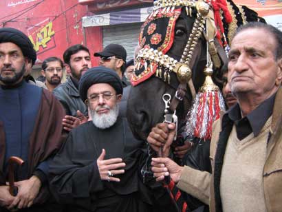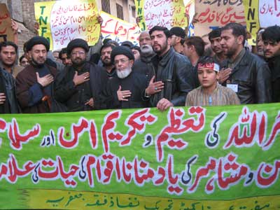 RAWALPINDI, February 5: The Chehlum of Nawasa-e-Rasool Hazrat Imam Hussain (A.S.) and his 72 faithful companions was observed with religious and national spirit, devotion and respect throughout the country Friday who sacrificed for survival of religion and Shariat and to give eternal lease of life to high values of humanity. Majalis Arbaeen-e-Hussaini were held and Zuljinah, Alam and Tazia processions were taken out in all big or small cities and towns on this occasion. In Rawalpindi, main Chehlum procession was taken out from Imambargah Col. Maqbool Hussain and Imambargah Hifazat Ali Shah Bohar Bazar. Zuljinah procession taken out from Imambargah Ashiq Hussain Teli Mohallah merged into the main procession. Mourners of Imam Hussain (A.S.) performed Zanjeer-Zani and presented Pursa of the Imam Aali Muqam (A.S.) to the Holy Prophet (SAW) on this occasion. The Quaid-i-Millat Jafariya Agha Syed Hamid Ali Shah Moosavi participated in the procession, offered Ziarat of the taburrakaat and performed Matamdari. Agha Moosavi answering a question from newsmen on this occasion said that solution to all problems faced by the Muslim Ummah lay in adopting the path of Nawasa-e-Rasool (A.S.) that is commensurate with Mazloomiyyat. Answering another question regarding Dr. Afia Siddiqui, he said it is an insult for the whole humanity that those who raise slogans for freedom of Kashmir and Palestine could not get a Pakistani daughter released. Seeking justice from America is like appointing a murderer as a judge. He said today Arbaeen-e-Hussaini is being observed all over the world and Kashmir and Palestine could only get freedom when we adopt the principles of these pious personalities. He said the Momin (believer) is not afraid of anyone and it should be kept in mind that we are followers of Ali Ibne Abi Talib (A.S.) a saying of whom goes: We plunge over death or death plunges over us, we love death that much that not even a infant has with the mothers milk. He said the live nations arrange for their security themselves, taking out procession is the basic right of everyone and staging protest is the Sunnah of Rasool (SAAW) and Azadari-e-Hussain is the eternal protest of the oppressed against oppression and brutality and it would continue till the restoration of justice and fair-play. He said the Day of Solidarity with Kashmir is observed without any spirit and one should keep in mind that Kashmir could only be achieved through Haideri power and Hussaini spirit. The participants of the procession carried out Zanjeer-Zani and Qama-Zani in Trunk Bazar, Habib Bank Chowk and turned into a big rally after reaching Fawwara Chowk where addressing the participants, Central Secretary Information of Tehreek Nafaz Fiqh-e-Jafariya, Pakistan, Syed Qamar Haider Zaidi said Arbaeen-e-Hussaini is the memory of Aseeran-e-Karbalas commitment and courage who shattered the Yazidi courts through their visionary and heart-rending addresses despite being chained so as to highlight the objective of Hussainiyyat. He said inheritor of the Hussains (A.S.) blood Imam Zainul Abideen (A.S.) and Sharikatul Hussain Hazrat Syeda Zainab (S.A.) through their khutbaat shattered the Yazidi courts and unveiled the fake Islamic faces of Yazid. Ch. Mushtaq Hussain addressed the gathering on the topic of philosophy of Shahadat. A resolution presented by the Central MSO President Syed Baqir Hussain Naqvi strongly condemned bomb blasts on the occasion of Chehlum of Syed-us-Shuhada in Karbala & Karachi and said the government has failed in unveiling the culprits of Muzaffarabad incident and Karachi incident and demanded that the real cause behind these incidents of terrorism should be brought forth and real culprits should be given exemplary punishment while innocent people arrested after the Karachi incident should be released forthwith. The resolution demanded from Chief Minister Punjab Shahbaz Sharif to get the 1st Safar Azadari procession taken out from Imambargah Sakina Binte Hussain, Rehmanpura, Lahore that was earlier stopped despite a decision in its favour from the High Court. Another resolution strongly condemned ignoring Maktab-e-Tashayyo in State departments. Another resolution condemned restrictions on the mosque minarets in Switzerland and restrictions on Hejab in France and other western States. Another resolution demanding the honourable restoration and reconstruction of Jannatul Baqee and Jannatul Moalla lamented that had Muslim kept the honour of Jannatul Baqee and Jannatul Moalla intact then no non-Muslim would have the courage to put the Al-Quds to light and razing the Babri Masjid to ground. Another resolution criticized that no government personality comes to Azadari processions and said the President, the Prime Minister, the Chief Ministers, Governors and Ministers belong to the whole Pakistan and not to any group, if it is so then they should visit the Azadari processions. A resolution fully supported all movements for independence including those of Kashmir and Palestine and demanded exodus of occupied forces from Iraq and Afghanistan. The resolution expressed complete solidarity with the Pakistans armed forces who are busy in operation to root out terrorism. The resolution expressed complete faith in the leadership of Quaid-i-Millat Jafariya Agha Syed Hamid Ali Shah Moosavi and reiterated resolve to offer any sacrifice for the achievement of pious targets. Later, participants of the main Chehlum procession performed historic Zanjeer-Zani in Raja Bazar. Zuljinah processions taken out from Imambargah Kashmirian Tyre Bazar and Darbar Shah Chan Chiragh also merged into the main procession at Purana Qila. The main Chehlum procession terminated at Imambargah Qadeem after passing through Jamia Masjid Road and Imambara Chowk. The participants of Zuljinah processions taken out from Imambargah Yadgar-e-Hussain Satellite Town and Imambargah Baltistania Angatpura performed Zanjeer-Zani at Banni Chowk. Both these processions terminated a