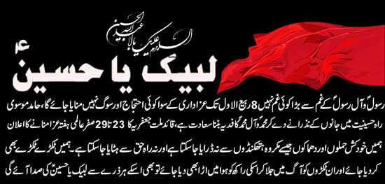 RAWALPINDI, February 6: The Quaid-i-Millat Jafariya, Pakistan, Agha Syed Hamid Ali Shah Moosavi has said that no grief is greater than that of Rasool (SAAW) and Aal-e-Rasool (A.S.) therefore, no protest or mourning will be observed except Azadari till 8th Rabiul Awwal. This was stated by him while announcing to observe International Hafta-e-Aza from 23-29 Safar in connection with the Wisaal of the Khatmi Martabat (SAAW) and Shahadat of Nawasa-e-Rasool Hazrat Imam Hassan Mujtaba (A.S.). He said today every city of Pakistan is grieved owing to colonial aggression and the satanic forces have not even spared the holiest month of Muharramul Haram and then hit the bus of Azadaran following by bomb blast at Jinnah Hospital in Karachi on the day of Chehlum that is a heinous conspiracy not only against Pakistan but also against the religion and Shariat. He said as Khanwada-e-Ahle Bait (A.S.) are defenders of Shariat and mankind, their followers are being targeted from Karbala to Karachi. Agha Moosavi said we, by following in the foot-steps of Khanwada-e-Ahle Bait (A.S.), want to prove that we can neither be threatened with the nefarious tactics of suicide attacks or blasts nor can be diverted from the right path. We want to declare that even we are cut into pieces and these pieces are burnt into ashes spread into the air, the every particle of this ash would raise the voice of Labbaik Ya Hussain (A.S.), he added. He said the Khanwada-e-Rasool (A.S.) presented exemplary sacrifices for the humanity, religion and Shariat and if we offer our lives in way of Hussainiyyat, it would be a blessing for us. We give priority to the Shuhada of Khanwada-e-Risalat (A.S.) over our deaths and Shahadat, and observe only their grief from 1st Muharram to 8th Rabiul Awwal because there is a saying of the Masoom (A.S.) that our followers are those who are happy in our happiness and are grieved in our grief. Only those are the Azadars of Hussain (A.S.) and devotees of Rasool (SAAW) who follow this path, he added.