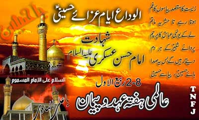 RAWALPINDI, February 15: The Quaid-i-Millat Jafariya Agha Syed Hamid Ali Shah Moosavi has said that the Parliament, judiciary, administration and media should utilize their energy in upgrading Pakistan instead of downgrading each other and create the spirit of patience and forbearance and courage to accept each other otherwise our combined enemy would benefit from the situation and all responsibility of any untoward situation faced by the country would rest with rulers and politicians. This was stated by him while announcing International Hafta Ehad-o-Paiman that is being observed from 2-8 Rabiul Awwal throughout the country marking the Shahadat of Imam Hassan Askari (A.S.) and say goodbye to Ayyam-e-Aza. Agha Moosavi said Azadari is our jugular vein and the biggest guarantee of survival of religion and Shariat. He said utilizing the human life for the supremacy of religion and Shariat is a good omen and presenting sacrifices of life is a great worship that is called Shahadat while Shahadat is the height of Bandagi and blessing. He said during the shortest era of life of Hazrat Imam Hassan Askari (A.S.) spread over 28 years the oppressive rulers tried to divert the Imam (A.S.) from religion and the right path because the oppressive and tyrant rulers in every era always desired to keep the religion and Shariat under their control rather they also desire to make amendments in it keeping to their own desires but the Khanwada-e-Muhammad (SAAW) and Aal-e-Muhammad (A.S.) never accepted the same. They openly made it clear on the world that Halal-e-Muhammad is actually Halal-e-Allah and Haram-e-Muhammad is actually Haram-e-Muhammad and no oppressor, dictator and tyrant ruler could change this status. The TNFJ chief said even Nabi and Rasool could not make any changes in religion and Shariat without Allahs permission. That is why, he added, Nawasa-e-Rasool Hazrat Imam Hussain (A.S.) preferred to sacrifice his life along with his 72 near and dear ones in the plain of Karbala so as to prove that no one including Yazid could make changes in the religion. He said Azadari is the greatest jehad against the oppressors and is the strongest citadel of religion and Shariat and the enemies of religion and Shariat have always faced humiliation from it. The Quaid-i-Millat Jafariya Agha Syed Hamid Ali Shah Moosavi paying condolences to the followers of Muhammad (SAAW) and Aal-e-Muhammad (A.S.) and pious Sahaba Kubaar reiterated his resolve to keep the religion and Shariat i.e. Hussainiyyat alive and peaceful universal protest of the oppressed world in the shape of Azadari will continue till the Zahoor-e-Mehdi. He appealed all countrymen to organize Majalis-e-Aza and Matmi processions and strongly condemn the colonial oppression going on in the oppressed world i.e. Kashmir, Palestine, Afghanistan and Iraq besides praying for the honour and dignity of the Islamic World and for the integrity and solidarity of motherland Pakistan. Meanwhile, TNFJ Committee has been formed to organize programmes for the International Hafta Ehad-o-Paiman. Dr. S.M. Rizvi has been nominated as Convener and Muhammad Abbas Baloch as Secretary of this Committee.