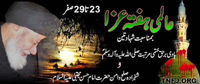 RAWALPINDI, February 14: The programmes of Hafta-e-Aza (Week of Mourning) announced by Quaid-i-Millat-i-Jafariya Agha Syed Hamid Ali Shah Moosavi in connection with the Wisal of Khatmi Martabat (SAAW) and Shahadat of Hazrat Imam Hassan Mujtaba (A.S.) concluded on Sunday Safar 29 with honour and respect.