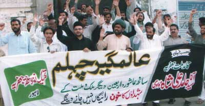 Later, the participants of the rally dispersed peacefully by raising different slogans after approving some resolutions presented to them by Syed Bu Ali Mehdi. Dua for Shuhada was led by Allama Zahid Abbas Kazmi. Meanwhile, according to reports reaching the offices of Universal Chehlum Committee of the TNFJ, a protest rally organized by TNFJ Provincial Council was taken out from Shia Jamia Masjid Koocha Risaldar, Peshawar. Sardar Abbas Ali Qazilbash, Maj. (Retd) Hasnain Kazmi, Mir Abu Ghazanfar and others led the rally that was terminated after reaching Kabli Thana Chowk. Shahzada Ghulam Hassan Bhatti and Ulema led a TNFJ rally staged in front of Lahore Press Club. TNFJ Provincial President Allam Waqar Hassan Taqvi, .M. Naqi, Makhdoom Sibte Hassan, Allama Baqir Naqvi and others led a similar rally staged in front of Karachi Press Club. TNFJ Provincial President Sardar Tariq Ahmed Jafri and others led a peaceful protest demonstration staged in Quetta. Protest rallies against the incidents of terrorism were also taken out from other small and big cities and towns of the country on the call of TNFJ.