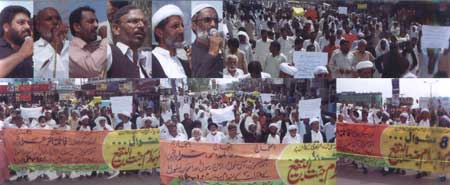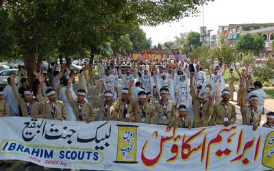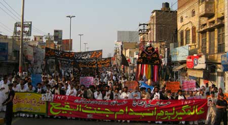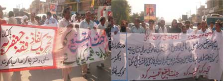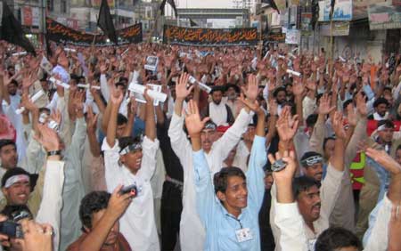 In Rawalpindi, the central Matmi protest demonstration was taken out from Imambargah Nasir Al-Aza, Chowk Waris Khan. Thousands of people participated in the rally and raised a voice of protest against the dilapidated condition of the Jannatul Baqee. The participants of the procession marched towards Committee Chowk passing through the Murree Road performing Matamdari and Noha-Khwani. The protest rally among others was led by Ulema Karam belonging to different schools of thought, office-bearers of TNFJ and other subordinate bodies, provincial, regional and district elite, leaders and Matmi Salars of religious organizations. Hundreds of minor workers of Mukhtar Generation and jawans of Ibrahim Scouts were carrying Shabih of Jannatul Baqee and were raising vociferous slogans against the destruction of holy shrines and in favour of reconstruction of the same while jawans of Mukhtar Organisation and MSO were holding black flag, portraits of Quaid-i-Millat Jafariya Agha Syed Hamid Ali Shah Moosavi and were carrying banners and placards inscribed with different slogans. The rally turned out to be a big public meeting after reaching the Committee Chowk where Syed Qamar Haider Zaidi, Central Secretary Information, TNFJ addressed the rally. Presenting the special message of the Quaid-i-Millat Jafariya Agha Syed Hamid Ali Shah Moosavi, he said the only way to solution of all problems confronted by the Muslim Ummah in annexation of Al-Quds Al-Sharif and independence of Kashmir is to get the dignity of Jannatul Baqee and Jannatul Moalla restored. The participants of the rally also adopted different resolutions among vociferous slogans. A resolution said the great shrines of Paighambar-e-Islams (SAAW) daughter Hazrat Fatima Zehra (S.A.), her offspring, Ummahatul Momineen (R.A.) and Sahaba Kubaar (R.A.) have become the symbol of disappointment. The resolution called upon the Muslim rulers to break their criminal silence. The resolution also demanded from the international organizations including the United Nations and Unesco, who claim to be the champions of worlds cultural heritage, to give attention on Jannatul Baqee and Jannatul Moalla also and get the dignity of the same restored because it is included in the United Nations Charter that this representative organisation of the world nations will not only protest the combined heritage of the mankind, its remains and signs but would also stop those who will cause their destruction. Another resolution strongly condemned Daily Jang for not publishing the advertisement given to them for Youm-e-Inhidam Jannatul Baqee. It expressed shock that the so-called big newspaper is not a spokesman of the people as they keep the liking and disliking of their masters dearer than Rasool-e-Khuda (SAAW), pious Sahaba Kubaar (R.A.), Ahle Bait Athaar (A.S.), Ummahatul Momineen (R.A.), and the Rasools (SAAW) mother. The resolution said that it is not an issue of Shia, Sunni or Barelvi but that of every human being and conscious and honourable Muslim the proof of which was given by Muhammad Ali Johar, Shorish Kashmiri, Maulana Shaukat Ali and is being given today by Quaid-i-Millat Jafaria Agha Syed Hamid Ali Shah Moosavi. The resolution made it clear that through this act of the newspaper; the hypocrisy of the so-called champions of freedom of the Press has been unveiled. When the human beings, institutions and States bargain their honour they stand nowhere that is why Muslim Ummah is being targeted by the colonial powers and Drone attacks are being conducted in the motherland day in and day out, it said. The resolution termed the newspapers action encroachment of the human rights. The resolution demanded implementation of May 21, 1985 Junejo-Moosavi agreement and exert pressure on the Saudi government under this agreement to restore the dignity of the holy shrines. The resolution while demanding to declare Makkah and Madinah as open cities warned the Muslim rulers to get ready to face more difficulties and problems if they did not do anything practical in this connection. The resolution lamented the international atheist was bent upon desecrating the signs of Allah and was committing continuous desecration of Quran, Khatmi Martabat (SAAW) and pious leaders of the religion under an organised international conspiracy. The resolution called upon the Muslim Ummah to come out of its shackle and give priority to the collective interest of the Islamic World instead of giving priority to their personal interests so as to stop the enemies of the religion and Shariat from committing desecration. The participants of the rally expressing their solidarity with the whole world of humanity in general and with the oppressed people of Kashmir, Palestine, Iraq and Afghanistan vowed to continue their practical struggle under the far-sighted leadership of Quaid-i-Millat Jafariya Agha Syed Hamid Ali Shah Moosavi in support of the righteousness, in expressing hatred against oppression, for achievement of rights of the Millat and for the integrity and solidarity of the motherland Pakistan and they will never hesitate in offering any sacrifice on his call. Later, the rally terminated at Imambargah Col. Maqbool Hussain after passing through its traditional route where special prayers marked the conclusion of the rally. Mukhtar Force volunteers escorted the rally throughout while District Administration had made fool-proof arrangements en route the rally. Police officers and jawans remained with the rally throughout. ISLAMABAD: In Federal Capital Islamabad, the protest procession was taken out by TNFJ District Islamabad Universal Youm-e-Inhidaam Jannatul Baqee Committee from Darbar Aalia Hazrat Sakhi Mahmood Badshah (father of Hazrat Bari Imam) near Aabpara.
