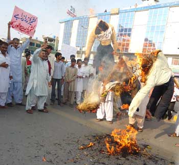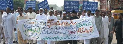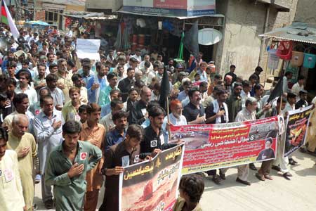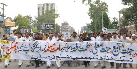 In Federal Capital Islamabad, a strong protest rally was held on Youm Al-Quds Himayat Mazloomin at Aabpara Chowk under the auspices of Youm Al-Quds Himayat Mazloomin Committee. The rally began from the Darbar of Hazrat Bari Sarkars father, Sakhi Mahmood Shah Badshah. It was led by Syed Shujaat Ali Bokhari Additional Secretary General TNFJ, District President TNFJ Islamabad Allama Basharat Hussain Imami, Allama Guftar Hussain Sadiqi, Allama Akhlaq Hussain Kazmi, Raja Zulfiqar Ali, Allama Fakhar Abbas Abidi, Allama Shiraz Hussain Kazmi, Syed Nazakat Hussain Kazmi, Malik-e-Ashtar Central Joint Secretary Information TNFJ, Prof. Ghulam Abbas Haideri, Sub. Asghar Haideri, Raja Muharram Ali, Qudrat Ullah Haideri, Syed Amjad Hussain Kazmi and others. Addressing the protest rally at Aabpara Chowk, Allama Syed Qamar Haider Zaidi Central Secretary Information TNFJ said that objective of observing Youm Al-Quds Himayat Mazloomin throughout the country is to express solidarity with the oppressed nations and Muslim people facing atrocities the world over. He said international organisations, the United Nations and the OIC are responsible for the problems confronted by the Islamic World. Allama Basharat Hussain Imami District President of the TNFJ in his address said the United Nations has not resolved any problem of world of humanity while the OIC failed to resolve any problems faced by the Islamic World as a result of which their reputation is put on stake. They will have to make their own independent decisions after getting rid of the American slavery so as to restore their pride. He appealed the Muslim rulers to form a joint platform for a practical joint struggle for annexation of Al-Quds Al-Sharif, achievement of Kashmir and to tackle the colonial oppression against Palestine, Lebanon, Iraq and Afghanistan. Allama Fakhar Abidi also addressed the gathering. A resolution adopted on the occasion called upon the Muslim rulers to stop performing Tawaf of Bait Al-Abyaz (White House) and bow only before Allah for the restoration of honour, strength and solidarity of the Muslim Ummah and consider attack on any country or Maslak as an attack on the whole Muslim Ummah irrespective of their geographical boundaries. Another resolution said that Tehreek Nafaz Fiqh-e-Jafariya was ready to cooperate in every good work in the larger interest of the nation and the country. Prays were offered on the occasion for rooting out of problems faced by the Muslim Ummah, and for the integrity, solidarity and development of the motherland Pakistan. The participants of the rally later dispersed peacefully. Meanwhile, according to reports reaching here from other parts of the country protest rallies in connection with the Youm Al-Quds Himayat-e-Mazloomin were taken out in Peshawar, Karachi, Lahore, Quetta, Muzaffarabad, Bagh, Dadu, Khairpur Mirs, Bhakkar, Chakwal, Dera Ghazi Khan, Multan, Sargodha, Sialkot, Gilgit, Faisalabad, Kohat, Sheikhupura, Gujranwala, Jhelum, Deena, Kasur, Gojra, Khanewal, Bahawalpur, Sukkur, Nawabshah, Sehwan Sharif, Noshero Feroze and other cities.