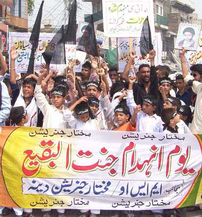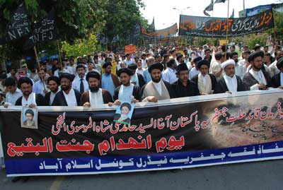 RAWALPINDI, September 8: The Universal Youm-e-Inhidaam Jannatul Baaqee was observed throughout the country on Wednesday on the call of Quaid-i-Millat Jafariya Agha Syed Hamid Ali Shah Moosavi to lodge protest against destruction of the holy shrines of Khatoon-e-Jannat Hazrat Syeda Fatima Zehra (S.A.) Ummahatul Momineen (R.A.) and Sahaba Kubaar (R.A.) in Jannatul Baqee and Jannatul Moalla at the hands of Saudi rulers on 8th Shawal, 1925. On this occasion Majalis-e-Aza were held and protest Matmi processions were taken out in all big cities and towns against the destruction of holy shrines.