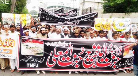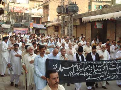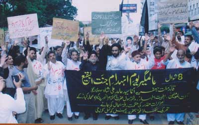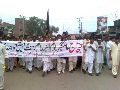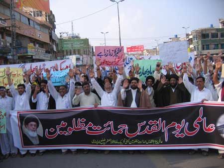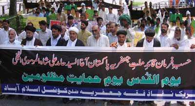 RAWALPINDI, August 26: Youm Al-Quds Himayat-e-Mazloomin was observed throughout the country on Juma-tul-Widah on the call of Quaid-i-Millat Jafariya Agha Syed Hamid Ali Shah Moosavi, with revival of commitment to continue support for the freedom fighters engaged in annexation of Al-Quds Al-Sharif and independence of Kashmir. Rallies and protest demonstrations were taken out in all small and big cities and towns of the country including Federal Capital Islamabad and Rawalpindi. Ulema and Khateebs in their Friday sermons made it clear that Al-Quds Al-Sharif is respectable not only in Islam but for the whole humanity which also include Shaair Allah and it is the duty of the Islamic World to get its sanctity restored by getting it annexed from the Zionist clutches.