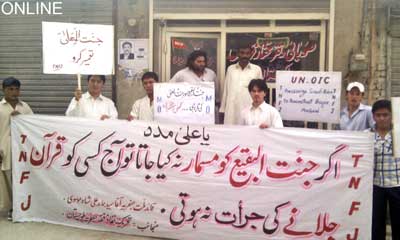 The TNFJ chief said when a single kiln of Gen. Ziaul Haqs grave is misplaced its echoes are heard throughout the country and everyone cried hoarse on the desecration of graves in Britain. But what a shame that holy shrines of Mashaheer-e-Deen and Shariat including Rasool-e-Akrams (SAAW) forefathers, Ahle Bait Atahaar (A.S.), Ummahatul Momineen (R.A.), Hazrat Usman Zunnorain (RA) and other Sahaba Karam placed in the holy graveyards of Jannatul Moalla and Jannatul Baqee were being razed and no one seems concerned about it, he added. He said it our rather the whole Muslim Ummahs duty to raise voice of protest against this oppression and excess and join our protest for the purpose. He said Muslims are confronted with one problem or the other today just because of their criminal silence on the destruction of shrines of religious elders, desecration of Quran and insult of Risalat. The enemy desires to divide us so as to rule all over the world, therefore, we shall be the first to continue our practical struggle for the restoration of holy shrines of the Mashaheer-e-Islam with sincerity of purpose so as to thwart their conspiracy, he added. The Quaid-i-Millat Jafariya Agha Syed Hamid Ali Shah Moosavi called upon the government to take steps under the May 21, 1985 Junejo-Moosavi agreement for the reconstruction of holy shrines of Jannatul Baqee and Jannatul Moalla by raising this issue on diplomatic level while OIC, ICC, Security Council and Arab League should fulfil their responsibilities in restoring and protecting the Islamic signs. He said like all international issues including Kashmir and Palestine are still on the international agenda despite no solution of the same, and efforts are going on for their solution, similarly we shall never give up our demand for the reconstruction of Jammatul Baqee and Jannatul Moalla. He said Makkah and Madinah are not the assets of any particular sect or a country but belong to the whole Islamic World, therefore, these should be declared open cities. He said we have no issue with anyone or any personality rather we consider those as enemies of Islam and humanity who cause any damage to Islam and Mashaheer-e-Islam. He appealed all countrymen to throng the Universal Youm-i-Inhidam Jannatul Baqee programmes on Shawal 8 so as to please Allah and become presentable in Bargah-e-Rasool (SAAW) and Batool (A.S.).