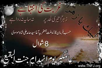Today, 90 years are going to complete but the act of wiping out the A large part of Madinah comprised oases and was not suitable for war and the It is mentionable that before sealing the door of Masjid Syeda Fatima Zehra جس قوم کی نگاہ میں بنت نبی کی حیا نہ ہو Had the Aal-e-Saud no fear of strong reaction of the Islamic World In the Timbuktu city of African country Male recently, four old shrines of the The American colonial powers are continuing the game of rooting out Islamic At present the whole world of humanity and the world of Shariat has been the مجروح پھر ہے عدل و مساوات کا شعار Therefore if the Muslim Ummah desires to turn their areas into a 1. Trampling the signs of benefactors of Islam is tantamount to inviting the 2. Commitment should be announced that not only occupied areas will be got freed 3. Many sessions of the OIC have been held but life would only penetrate in it 4. The colonial power has inducted herself in Muslim States in the garb of 5. It has to be made clear on the world that attack on any Muslim State and This objective of observing Universal Youm-e-Inhidam Jannatul Baqee is to raise جو کفن پہن کے نکل پڑے توستم کا نقش مٹا دیا This protest of Tehreek Nafaz Fiqh-e-Jafariya is not against any نالہ نہیں یہ گنبد خضریٰ کی ہے فریاد All powers should keep in mind that Jannatul Moallah and Jannatul وہ نبی (ص)کی قبرنے دی صدا مرے لال آ مرے لال آ