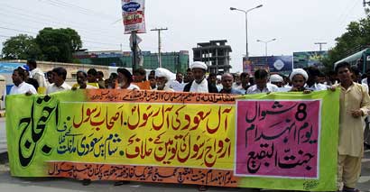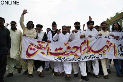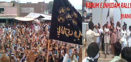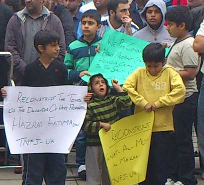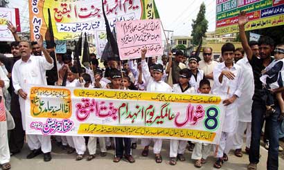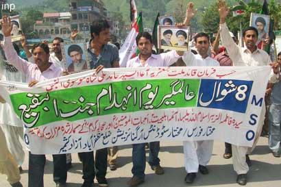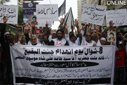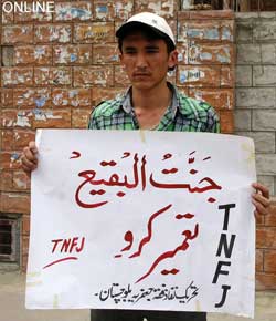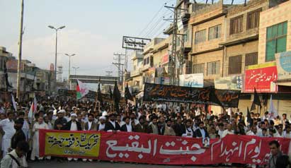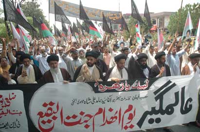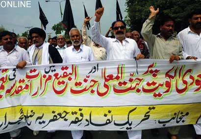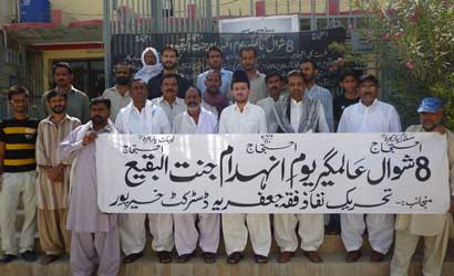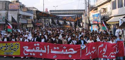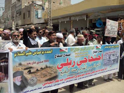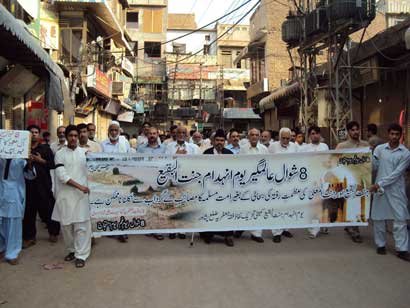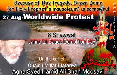 The protest rally among others was led by Ulema Karam belonging to different schools of thought, office-bearers of TNFJ and other subordinate bodies, provincial, regional and district elite, leaders and Matmi Salars of religious organizations. The participants of the procession marched towards Committee Chowk through marching the Murree Road performing Matamdari and Noha-Khwani where it took the shape of a grand rally. The rally was led by Ulem belonging to different schools of thought, office-bearers of central and subordinate sections of the TNFJ, provincial, regional and district elite and leaders and Matmi Salars of the religious organisations. The minor workers of Mukhtar Generation and jawans of Ibrahim Scouts were carrying Shabih of Jannatul Baqee, and banners and placards inscribed with different slogans. At this point Allama Syed Mohsin Ali Hamadi, addressing the rally lamented that the shrines of those holy personalities on which every conscious Muslims is grieved. Allama Syed Tasawwar Hussain Naqvi also addressed the gathering. A few resolutions presented by Abbas Jafri were also adopted unanimously on the occasion. One of the resolutions said the whole Islamic World has become the symbol of protest of the destruction of mazars of Madar-e-Rasool Hazrat Bibi Amna, home of the Paighambar-e-Islam (SAAW) and other holy places after the destruction of holy mazars of Ahle Bait Athaar (A.S.,) Sahaba Kubaar, and Ummahatul Momineen at the hands of Aal-e-Saud. A resolution strongly condemned the criminal silence on the part of Islamic States, OIC and Arab League on the destruction of Jannatul Baqee and Jannatul Moallah and said if the interests of Islamic States are on risk then they are pitched against brother Muslim States forgetting all relations of brotherhood and mutual understanding but it is tragic that none of the Islamic States lodged any protest with Saudi Arabia at diplomatic level against the destruction of this great asset. The resolution also condemned double standards of the international organizations including the United Nations and UNESCO who claim to be the champions of worlds cultural heritage. The resolution also criticized the international media for ignoring the destruction of mazars of Mashaheer-e-Islam. Another resolution demanded to declare Makkah and Madinah the status of international cities so that the Islamic signs could be protected from continuous destruction. The resolution made it clear that this protest is not against any country, Maslak or a family but against the attack on Shia-Sunni brethren. The participants of the rally expressed their solidarity with the whole oppressed world particularly the innocent people of Kashsmir, Palestine, Iraq, Afghanistan. The resolution said that the protest against the destruction of Jannatul Baqee and Jannatul Moallah would continue till the restoration of the dignity of holy mazars. Later, the rally terminated at Imambargah Col. Maqbool Hussain after passing through its traditional route where special prayers marked the conclusion of the rally. Mukhtar Force volunteers escorted the rally throughout while District Administration had made fool-proof arrangements en route the rally. Police officers and jawans remained with the rally throughout. Meanwhile according to reports reaching the offices of Universal Youm-e-Inhidaam Jannatul Baqee Committee, the protest rallies were also organised and Majalis-e-Aza were held in Peshawar, Lahore, Karachi, Chakwal, Larkana, Faisalabad, Quetta, Jhelum, Sialkot, Muzaffarabad, Hyderabad, Sukkur, Gilgit, Bhakkar, Multan, Kasur, and Khairpur. London