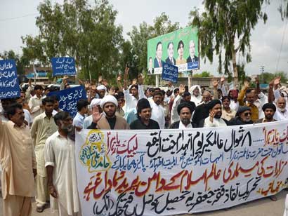 RAWALPINDI, August 17: Youm Al-Quds Himayat-e-Mazloomin was observed throughout the country on Juma-tul-Widah on the call of Quaid-i-Millat Jafariya Agha Syed Hamid Ali Shah Moosavi on the occasion of Internatinal Youm Al-Quds Himayat-e-Mazloomin during which protest rallies and protest demonstrations were taken out in all small and big cities and towns of the country against Zionist occupation of Qibla-e-Awwal, Zionist and Hindu oppressions in Palestine and Kashmir, incident of Babusar Gilgit, and terrorist attack on Kamra Airbas. In Federal Capital Islamabad, a strong protest rally was taken out from Hazrat Bari Sarkars father Sakhi Mahmood Badshahs Darbar. It was led by Syed Shujaat Ali Bokhari Additional Secretary General TNFJ, Shaikat Abbas Jafri, Agha Syed Muhammad Murtaza Moosavi Advocate, Agha Syed Ali Roohul Abbas Moosavi Advocate, Allama Guftar Hussain Sadiqi, Allama Syed Muhammad Ali Hussaini, Maulana Shahzad Hussain Sundi, Bawa Syed Dilbar Shah Naqvi, Z.A. Raja, Prof. Ghulam Abbas Haideri, Asghar Haideri, Qudrat Ullah Haideri and others. The rally was addressed by District Convener of the TNFJ Youm Al-Quds Himayat-e-Mazloomin Committee Islamabad, Mukhtar Force Chairman Ch. Abu Baidar Ali, and others. A resolution adopted on the occasion among vociferous slogans said that International Youm Al-Quds Himayat-e-Mazloomin is being observed today at a time when the whole world of humanity, particularly the Muslim States, have become the target of colonial powers and some are still being targeted. The recent Makkah Summit of the OIC indicates that it was summoned on the desire of international chief of colonial powers only and only to suspend the membership of Syria despite a fact to the contrary that if there is any objection about any member then it is given a chance to present its point of view by inviting to the meeting but Syria was not even invited for the recent meeting and her membership has been suspended without listening to their point of view which is extremely unjustifiable act performed to please the international chief of colonial powers. The resolution said that in this situation no one should remain in any good understanding because it is now the working methodology of the international chief of colonial powers that she gets the membership of the country suspended through Arab League when she desires to carry out any activity against any Arab States so as to pave way for that activity. This is what happened with Tunis, Egypt, Yemen and Libya and it is the turn of Syria. The satanic forces are trampling the people of the Muslim States through OIC and Arab League and in these countries no one could preach his own beliefs. In Bahrain, minority is ruling the majority where a Muslim State has entered her forces to help the Bahraini government and the innocent people there are being killed heinously. Both Arab League and OIC neither listen to their woes nor international powers are attracted to their voice. The resolution further said that had the OIC any life then instead of taking a decision to take the issue of oppression against Burma to the United Nations, it would have taken a courageous step itself. The question arises that whether the United Nations Organisation is blind that it could not see this oppression contrary to the activities they see in Mashriqi Taimoor and Sudan and also carry out plebiscite there because Muslims are being targeted there while despite presence of United Nations Resolutions about the Kashmir and the Palestine issues these long-standing issues are still unresolved just because of an organisation like the United Nations has been keeping these issues to its toes. Why this Hippocratic attitude against Muslims? The Islamic World needs answer to this question from the international organisations. The resolution lamented that that despite passage of half a century the Muslim Ummah could not get Al-Quds Al-Sharif rid of the Zionist clutches but America and her agent international organisations are further strengthening Israel rather Arab States are being used to get Arab States exit Arab League to bring changes in those States so as to weaken these States and impose Israeli supremacy there. Later, the participants of the rally burnt the effigy of American President Obama and raised vociferous slogans against America, Israel, and India. They then returned to Darbar Sakhi Mahmood Shah Badshah where special prays were offered for rooting out of problems faced by the Muslim Ummah, and for the integrity, solidarity and development of the motherland Pakistan. The participants of the rally later dispersed peacefully. RAWALPINDI: In Rawalpindi, main Youm Al-Quds Himayat Mazloomin procession was taken out from Imambargah Ashiq Hussain Teli Mohallah under the auspices of District Youm Al-Quds Himayat Mazloomin Committee of the TNFJ. The procession was led by Meesam Tammar Jafri Central Convener of Youm Al-Quds Himayat-e-Mazloomin Committee, TNFJ Regional Council Rawalpindi President Allama Syed Abul Hassan Taqi, Allama Mohsin Ali Hamdani, Allama Hussain Muqaddasi, Alhaj Ghulam Murtaza Chauhan, Ch. Abu Baidar Ali, Syed Amjad Hussain Naqvi, Saleem Hussain Bangash, Allama Waqar Hussain Naqvi Al-Qummi, Allama Javed Haideri, Allama Sajjad Gardezi, Secretary International Youm Al-Quds Himayat Mazloomin Committee Dr. S.M. Rizvi, Sajjad Hussain Kazmi, Farzand Ali Shah and others.