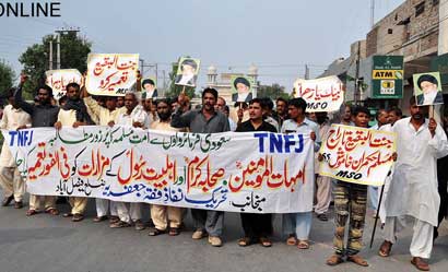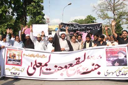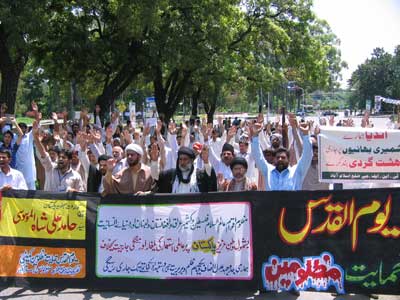 After reaching Committee Chowk, Allama Syed Qamar Haider Zaidi Central Secretary Information TNFJ addressing the rally said that the day is being observed at a time when attacked Kamra Airbase on 27th of Ramazan which also the Pakistan Day and when the Gilgit-bound bus was attacked and innocent fasting passengers were given a bloodbath which is tragic and condemnable. These incidents, he added, has unveiled the government claims. Markazi Convener Meesam Tammar in his address said that the contacts of the Federal and Provincial government with the banned groups are the basic reason of incidents of terrorism, murder and arson. He appealed the Chief Justice to take immediate notice of this precarious situation and take concrete and practical steps to get the people rid of terrorism and those banned groups that are responsible for it. A resolution unanimous adopted by the participants of the rally on the occasion condemning the colonial activities going on in Muslim States and terrorist activities in Pakistan by its perpetual enemies said that this nefarious tactics are an open challenge to the Muslim Ummah and the Pakistani nation. The resolution said the whole nation is the symbol of protest on the occasion of International Youm Al-Quds Himayat-e-Mazloomin that is their basic right and it would continue till the oppressed reach their fate. The resolution demanded from the government to give exemplary punishment to the gory terrorists who were turning the foundations of the motherland hollow through continuous incidents of terrorism. It strongly demanded from the Government of Pakistan to take concrete protective measures to make the sensitive routes to Shahrahs Gilgit-Baltistan, Quetta-Taftaan, Peshawar-Parachina free of any risk for the citizen travelling on these routes because contrary to the government claims many incidents have taken place on these routes killing dozens of innocent people and hundreds of them were still under treatment in hospitals. Ensuring that these Shahrahs are made risk-free is the responsibility of the provincial governments. Similarly, Pakistan Airbase and the GHQ had been targeted by terrorism; therefore, the government should take concrete steps to root out terrorism and for the protection of life and property of the people instead of giving a mere lip-service. In this connection ban should immediately be imposed on the already banned groups working with new names. The participants of the rally resolved their commitment that they will continue their practical struggle in the larger interest of Islam, Pakistan and its people. No power on earth could create differences amongst us. We are one and will thwart every conspiracy and mischief of our combined enemy by becoming one and pious through our exemplary unity, they said. Meanwhile, according to reports reaching here from other parts of the country protest rallies in connection with the Youm Al-Quds Himayat-e-Mazloomin were taken out from Imambargah Ghulam Haider Mohallah Rassi Wattan in Peshawar, Muhammadia Imambargah Dera Ghazi Khan, Shah Faisal Colony Karachi, Qasr-e-Zainab Bhakkr, Bargah Wali Al-Asr Multan, Adda Pasrorian Sialkot, Muzaffarabad, Bagh, Dadu, Khairpur Mirs, Chakwal, Sargodha, Gilgit, Faisalabad, Kohat, Sheikhupura, Gujranwala, Jhelum, Deena, Kasur, Gojra, Khanewal, Bahawalpur, Sukkur, Nawabshah, Sehwan Sharif, Noshero Feroze and other cities.