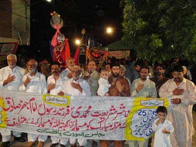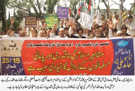 RAWALPINDI, August 22: The programmes of International Ashra SadiqAal-e-Muhammad announced by Quaid-i-Millat Jafariya Agha Syed Hamid Ali Shah Moosavi concluded on Friday 25 Shawwal with devotion, respect and commitment to continue the efforts to achieve the high targets of the Holy Prophet (SAAW), Ahle Bait Athaar (A.S.), and pious SahabaKubar (R.A.) and no sacrifice will be hesitated in this connection. Majalis-e-Aza were organised and Taboot processions were taken out throughout the country on this occasion while peaceful demonstrations were held against the razing to ground the holy shrine of religious elders including Imam JafarSadiq (A.S.), particularly in JannatulBaqee and JannatulMoallah and with demand for the reconstruction of the same with utmost dignity. They also condemned oppression and atrocities being carried out by the Saudi government particularly the punishment of hanging announced for Saudi elderly scholar Ayatollah Baqar Al-Nimr and called upon the Saudi government to give the right to live with freedom to all schools of thought. The main peaceful protest rally was taken out by from Jamia Masjid Sakhi Shah Piyara Kazmi Al-MashadiChaurHarpal after Juma prayers under the auspices of Mukhtar Organisation which was led by Central President of the Organisation Ali Furqani, Central President Mukhtar SO Syed Muhammad Abbas Kazmi and other elite. The rally turned out into a public meeting after reaching the main road.