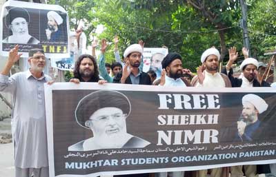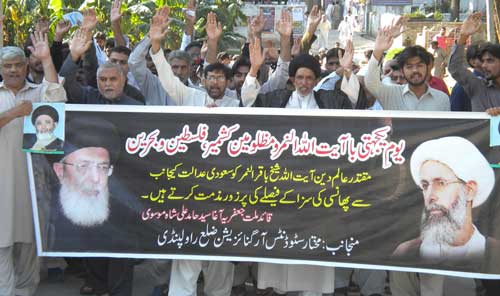 In his address to the rally, Maulana Temoor ul Hassan Malik said that by the resumption of Israeli attacks on Ghaza; it has been proved that there exists no law in the world and no one can dare to stop Jewish campaign. Muslim states are fighting against each other while their common enemy is benefitting from their internal clashes. In such grave situation, the death punishment to the religious scholar Sheikh Baqir al Namr will further weaken the Muslims. Ali Mehdi Naqvi, and Mardan Changezi also addressed the protest rally. On this occasion, resolutions were passed which appealed to the Khadim al Harmain Shareefen to intervene for the immediate freedom of Sheikh Baqri al Namr while also take steps to end discriminatory actions. Another resolution demanded to formulate a joint defense line to defend from Israeli aggression against Ghaza. Another resolution condemned the terrorist acts of ISIS against the holy shrines and mausoleums of holy Prophets in Iraq; and condemned the inhuman behavior of ISIS against the non-Muslim minorities, calling it as against the teachings of Islam and appealed to the Muslim Ummah to formulate a joint policy and take steps to stop this Jewish conspiracy. Another resolution expressed full support for the Pak Armys operation Zarb e Azb aimed at obliterating the menace of terrorism and appealed to the politicians and rulers to give preference to the national interests over their personal objectives. On this occasion special prayers were offered for the glory of Islamic world, protection of sacred sites, stopping of inhuman crimes in Iraq, Syria, Bahrain, stoppage of Israeli aggression against Ghaza, and success of Pakistan Army and victory of deprived and have-nots.