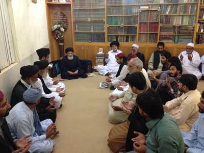 RAWALPINDI, October 15: The Patron-in-Chief of Supreme Shia Ulema Board Quaid-i-Millat Jafariya Agha Syed Hamid Ali Shah Moosavis has strongly condemned the suicide attack on Aman Lashkar in Tirah Valley and declared it the activity of agents busy in fulfilling the satanic agenda. He was addressing the Mehfil-e-Ghadeer in connection with the Universal Hafta-e-Wilayat here at Al-Murtaza Wednesday. Agha Moosavi stressed the need to root out terrorism and adopt the life-style of Ali (A.S.) that is the highest example for the world of mankind to follow. He said Islam not only gives importance to peace and tranquillity but has always condemned biases, hatred and enmity and practically expresses hatred against terrorism, oppression and brutality. He said the Islamic World is being made target of terrorism as a punishment for preaching peace and tranquillity because the Zionist world thinks that preaching peace and tranquillity is cowardice and weakness that is why all Muslim States are their target and the biggest matter of concern is that Muslim rules themselves were working on the international colonial agenda because they keep their rule dearer. The TNFJ chief said that Pakistan is confronted with terrorism after 9/11, and we have borne loss of billions of rupees, while thousands innocent Muslim kissed Shahadat. He said the Pakistan Armys Operation Zarb-e-Azb has made the life of terrorists difficult that is why they are playing heinous game in confusion. He said the tragic incident in Tirah Valley is the part of that conspiracy which is condemnable. He said that restoration of justice and rooting out of oppression and brutality is ultimate desire of Amirul Momineen Hazrat Ali Ibne Abi Talib (A.S.). He said people sitting around Omer Bin Abdel Aziz posed a question that who is the most pious person in the world. Someone said that he is Abuzar (R.A.) but Omer Bin Abdel Aziz replied that Ali (A.S.) is the most pious person in the universe. He said Hazrat Ali (A.S.) used to gather Fuqara and Masakeen around him and express love with them. He said that there is a saying of the Maula-e-Kainaat (A.S.) that goes that the best saying is the one that is confirmed through the deeds. Therefore, coherence in the words and deeds is necessary for solution to problems and to root out issues. The Quaid-i-Millat Jafariya Agha Syed Hamid Ali Shah Moosavi said that in Pakistan terrorism has made the life of people difficult, no one is taking care of the flood affected, the IDPs coming from Waziristan are upset and in these circumstances the rulers and the politicians should come out from their shackle and give priority to the integrity of the nation and the country over all other matters so as to thwart the colonial agenda and Zionist tactics.
