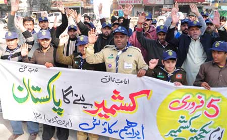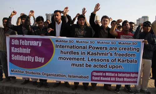 ISLAMABAD, February 05: Day of solidarity of Kashmiris is also been observed on the call of Chief of Shia Ulema Board Quaid-i-Millat Jafariya Agha Syed Hamid Ali Shah Moosavi on Thursday with national zeal and spirit. In this conection protest rallies were held at all big cities of the country including federal capital Islamabad. Mukhtar Students Organization staged a protest rally in front of National Press Club Islamabad, large number of workers participated in rally and demanded for peaceful resolution of the issue. Addressing the rally Central President of MSO Syed Muhammad Abass Kazmi presented the Spacial Massage of Quaid-i-Millat Jafariya Agha Syed Hamid Ali Shah Moosavi, in which he said that considering the independence of Kashmir and annexation of Al-Quds Al-Sharif will be considered a must for solution of these long-standing issues in line with the United Nations Resolutions and desires of the Kashmiri and Palestinian people so as to turn the Middle East and South Asia regions into a hub of peace. Agha Moosavi said the attitude of the United Nations and international organisations viz. Muslims is Hippocratic. He said if the Kashmir and Palestinian issues are not resolved under the United Nations Resolutions then United States of Muslims should be formed so as to apprise the world that if the international colonial powers can unite then Muslims the world over can also unite through practical display of unity so as to get rid of the international satan and get their issues resolved. He said the blood, shed in the Army Public School Peshawar, Shikarpur incident, and other incidents in Karachi and Balochistan is a debt on rulers and the whole nations. He said tributes will be paid to the Pakistans Armed Forces and homage will be paid to the Shuhada of the nation by observing Youm-e-Tarheem on Friday in which commitment to support the continuation of Operation Zarb-e-Azb will also be made. This was stated by him in a message issued on the occasion of Day of Solidarity with Kashmir that is being observed throughout the country Thursday (today). Agha Moosavi lamented that the enemy is putting the whole Islamic World in fire of biases and hatred while Muslims are pitching themselves against each other instead of annexation of Al-Quds Al-Sharif, freedom of Palestine and independence of Kashmir. He said the colonial arms are being used everywhere while the United Nations and the international organisations are displaying duplicity in their character as they have arranged plebiscite in Mashriqi Taimoor, South Sudan and Scotland but they did not resolve the Kashmir and Palestine issues because these are the problems of the Muslims. He lamented that if Muslims demand right of self-determination in the Muslim-majority areas they are declared extremists and terrorists while the similar demands if made by Hindus, Zionists and Christians term them freedom-loving.
