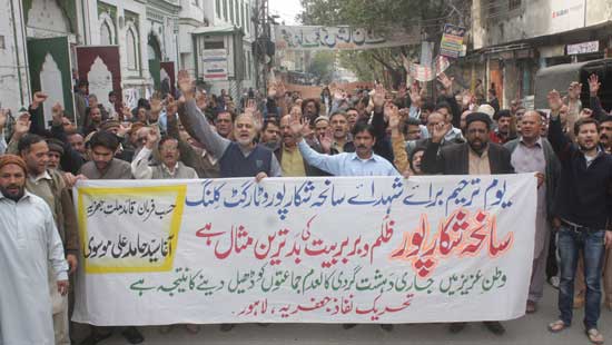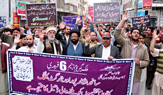 He expressed his concern that at present the whole world, particularly Pakistan, is the target of terrorists. He said the injuries of minor Shuhada of Army Public School Peshawar were still intact when the monsters gave bloodbath to dozens of innocent Nimazis in Shikarpur. He said Pakistan is being punished for following Nazria-e-Asaasi and becoming an atomic power. He strongly condemned all incidents of terrorism, prayed for the all those who kissed Shahadat and all those Momineen and Muslims who died and while expressing heartfelt sympathies with the bereaved families demanded from the government to punish all culprits of these incidents because these incidents are the heinous conspiracy against the motherland. The TNFJ chief demanded from the government to put its hands on facilitators of terrorists who are afraid of Operation Zarb-e-Azb and do not recognize banned groups using names of Masalik as the followers of recognised schools of thought. The demonstrators raised vociferous slogans in favour of their demands and later dispersed peacefully.