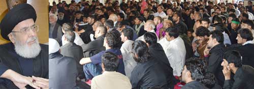 ISLAMABAD, October 27: The Patron-in-Chief of Supreme Shia Ulema Board, Quaid-i-Tehreek Nafaz Fiqh-e-Jafariya, Agha Syed Hamid Ali Shah Moosavi has said that disaster of terrible earthquake is to attract the faithfuls towards Zaat-e-Illahi and warn the non-Momins. The world has given up spiritualism and adopted the path of materialism, homes are the hub of westernization, Maaroofaat are being insulted and Munkiraat are being committed. The whole nation should recite Namaz-e-Ayaat and seek forgiveness from Allah with a true heart, all and sundry should accept that the Allah is Glorious. The humanity will have to follow in the footsteps of Shaheed-e-Insaniyyat Hussain Ibne Ali (A.S.) so as to get the humanity rid of all problems and difficulties. The Mazloom-e-Karbala Hussain Ibne Ali (A.S.) got recognition of Allahs Greatness by getting his throat cut and by sacrificing his whole family. These views were expressed by him while addressing the Majlis-e-Soyem of the Shuhada-e-Karbala. He also announced observation of International Ashra Beemar-e-Karbala from 15 to 25 Muharram on this occasion. Agha Moosavi said that the objective of Nawasa-e-Rasool Hussain Ibne Alis (A.S.) stay, as the Imam Aali Muqaam (A.S.) himself said, was to reform the Ummat-e-Muhammadi, order Maaroofaat, stop from Munkiraat, follow the seerat of his Nana Muhammad (SAAW) and Baba Ali (A.S.). It was an era in which the Godly commandments and sayings of the Hazoor (SAAW) were being made a laughing stock. It was from amongst the obligations of Imamat and Wilayat of Hussain (A.S.) to get the Ummat-e-Rasool rid of evil and put them on the right path. Therefore, he sacrificed all he had to the dignity of mankind and survival and integrity of the religion and Shariat. He said the enemy forces thought that martyring Hussain (A.S.) and his offspring and companions is a big success and they will extend their agenda of committing the evil things further but the Sherdil daughter of Ali (A.S.) and sister of the Shabbir (A.S.) Hazrat Zainab (S.A.) shattered the streets of Kufa and Shaam and the courts of Ibne Ziad and Yazid through her golden addresses. The TNFJ chief said that Pakistan came into being in the name of Islam but the objectives of its creation were not fulfilled after the demise of Quaid-i-Azam. Therefore, he added, the motherland was continuously confronted with all types of difficulties and problems. He said the Nature keeps on reminding us that Pakistans Asaasi ideology is Islam, our survival lies in Pakistans development and enforcement of Islam, in giving equal rights to all recognised schools of thought on the basis of equality and achievement of rights for minorities. The Quaid-i-Millat Jafariya Agha Syed Hamid Ali Shah Moosavi said it is Allahs promise with the Paighambar-e-Islam (SAAW) that no wrath will come on the Ummah till you are in the Ummah but if someone seeks the wrath of God himself then the wrath could not be stopped. Like Nauman Bin Fehri sought wrath on the occasion of announcement of Wilayat-e-Ali (A.S.) by the Holy Prophet on his return from Hujjatul Widah at the place of Ghadeer-e-Khum saying if it true then Allah may send wrath on me. Therefore, Allah Sent the wrath and he was killed there and then. This incident is stated in the Surah Al-Maarij, Ayah No. 1, he added.