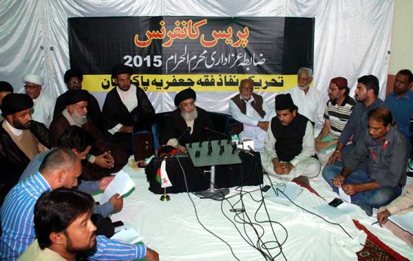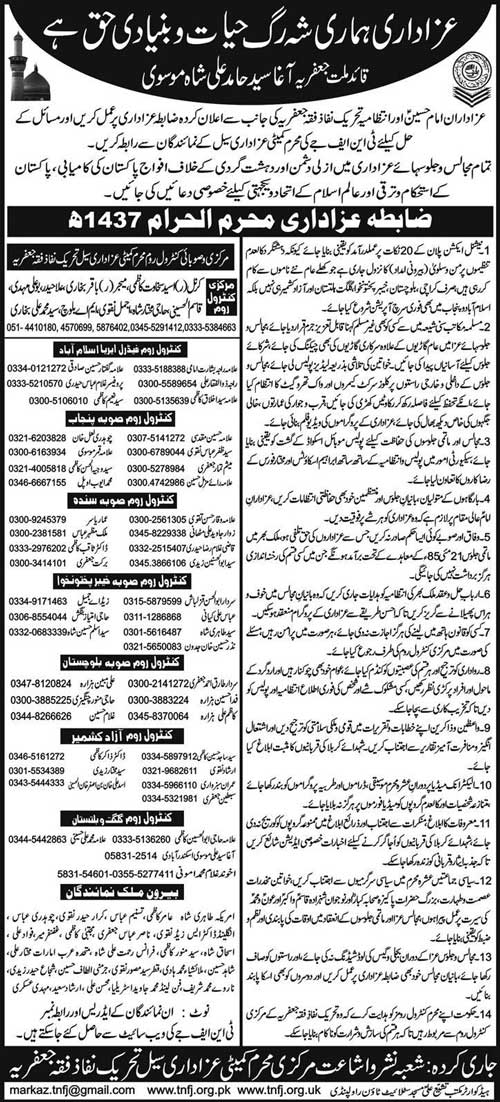 (1) The implementation of the 20 points of the National Action Plan may be ensured as Mann-o-Salva (foreign aid) is still being received by banned terrorist organisations who are openly working with new names. Immediate search operation should begin not only in Karachi, Balochistan, Khyber-Pakhtunkhwa, Gilgit-Baltistan and Azad Kashmir but also in Islamabad and Punjab; (2) Declaring any of the recognised Makatib of Sunni, Shia as non-Muslims should be declared a cognizable offence. In addition to general vehicles the public vehicles also be checked, participants of procession by facilitated, checking of women be carried out through ladies police. CCTV cameras and walk-through gates be installed at the internal and external paths to Majalis and processions, hurdles be installed with some distance for the protection of Majalis and Azadari processions and special watch on high-rise buildings be made, video film be made of all Majalis and processions; (3) Patrolling by police mobile squads, Elite Force may be ensured for the protection of Majalis and Matmi processions. Cooperation may be sought from Ibrahim Scouts and Mukhtar Force along with police and administration in security matters; (4) Caretakers and administration of Imambargahs may arrange protective measures themselves also. Azadaran-e-Imam Aali Muqaam (A.S.) are under the obligation to give priority to Azadari over all other matters; (5) Centre and provinces may not impose any such order that may encroach upon the rights of the Azadaran. Azadari processions all over the country will be taken out in the light of May 21, 1985 Junejo-Moosavi Agreement and no interference whatsoever will be borne in this connection; (6) The powers that be may order the administrations throughout the country to avoid creating fear and harassment amongst the organisers of Majalis so that Azadari rites and performed amicably; (7) No one may be allowed to take law into his own hands in any case. The Central Control Room may be contacted in case of any issue; (8) Tolerance by given priority and all types of biases may be condemned. People may remain fully alert themselves and keep an eye on the situation around and immediately inform the administration and police if they notice any suspicious thing or person so as to avoid subversive activities; (9) Ulema and Zakireen may give priority to national integrity in their addresses and avoid speeches that are provocative and are based on hatred. Sacrifices of Shuhada-e-Karbala may be preached in a positive manner; (10) Musical and comedy programmes may be suspended during the Ashra-e-Muharram on the electronic media and controversial and banned groups may be avoided invitations to media forums; (11) Maaroofaat may be preached, Munkiraat may be avoided and banned groups may not be given coverage on the media. The newspapers may publish special editions on the topics highlighting the sacrifices rendered by the Shuhada-e-Karbala so as to keep the spirit of selflessness and sacrifice alive; (12) Political parties may avoid political activities during the Ashra-e-Muharram. Women should follow the seerat of Mukhaderat-e-Ismat and Taharat, elder people may follow the seerat of pious Sahaba Kubaar (R.A.) and the youngsters that of Shahzada Qasim (A.S.), Akbar (A.S.), and Aun-o-Muhammad (A.S.). Timings and discipline be ensured in organising Majalis and Azadari processions; (13) Power and gas load-shedding may not be exercised during Majalis and Azadari processions and routes may be kept clean. The organisers of Majalis may follow the Code of Azadari themselves and also make it binding on others; (14) The government may direct its Muharram Control Rooms to coordinate with the Central Control Room of Tehreek Nafaz Fiqh-e-Jafariya so as to thwart every conspiracy and mischief. Agha Moosavi said that the month of Muharram laced with honour, dignity and status and prestige reminds the blood-dipped eternal sacrifice of Nawasa-e-Rasool Al-Saqlain, Shahzada-e-Konain Hazrat Imam Hussain (A.S.) and his obedient and faithful companions and offspring that enjoys the greatest place in the human history that is unable to present any such example of this greatest sacrifice ever. In Shariat-e-Mustafvi (SAAW) this sacrifice was declared the source of nearing to Allah that is the source of submissiveness in the Illahi court that creates the spirit of not avoiding to sacrifice for the supremacy of world in Shariah, unity of the Islamic World, security of the nation and the Millat and higher religious values. The TNFJ chief said that today, the Islamic World and the motherland Pakistan are confronted with host of problems, difficulties and crises, oppression and brutality are flooded from all around. After the Russian defeat and erosion, the international satan shattered the Muslim States, toppled the abodes by abodes and are destructing the Muslim States through the creator terrorists, Pakistan that played as a front-line ally after 9/11 is on their target, every part of the motherland is wounded, more than 70 thousand security personnel have sacrificed their life, more than 90 billion losses have been suffered. The Pakistans Armed Forces have made the life of terrorists difficult by laying Action Plan and starting Operation Zarb-e-Azb. In this situation, he said, our perpetual enemy has become more active and is committing continuous provocations on the Working Boundary and the Line of Control and is hurling threat after threat. The China-Pakistan Economic Corridor has snatched their sleep, she considered the Operation Zarb-e-Azb as her death but never loses any opportunity to cause harm to Pakistan. We are observing the remembrance of the Nawasa-e-Rasool Imam Aali Muqaam Hussain Ibne Ali (A.S.) in Muharramul Haram in this critical situation. Therefore we all are under the obligation to give priority to the protection of Pakistan over all other things, support the Pakistans Armed Forces, become the concrete wall against the enemy in thei