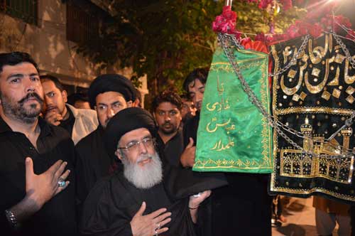 ISLAMABAD, October 22: The central procession of Zuljinah, Alam, Taboot and Gehwara Shahzada Ali Asghar (A.S.) was taken out in the Federal Capital Islamabad from Masjid and ImambargahJamiatul Murtaza G-9/4 Thursday under the leadership of Quaid-i-MillatJafariya Agha Syed Hamid Ali Shah Moosavi to remember the sacrifices of Nawasa-e-Rasool (A.S.) and his near and dear ones in the plains of Karbala in which dozens of MatmiDastas and thousands of Azadaran Mazloom-e-Karbala (A.S.) participated in it. The Patron-in-Chief of the Supreme Shia Ulema Board Quaid Tehreek Nafaz Fiqh-e-Jafariya Agha Syed Hamid Ali Shah Moosavi while talking to electronic and print media said the satanic forces were carrying out aggression against the Islamic World with full force and Islam and Pakistan can be saved by following the path of Hussain. He said the bomb blast at Bolan Bhaag Imam bargah is the work of terrorists who are destabilized by the Operation Zarb-e-Azb. He said the people should remain peaceful and give priority to Azadari. He said the conspiracies of the international powers are on peak for sabotaging the Pakistans nuclear power. He said decision to thrown Pakistan in the American lap was wrong as America remained unfaithful to us in every difficult moment. He said the punishments of the American camp had to be suffered by Pakistan as we were made the front-line allies after the 9/11 but benefits were awarded to India. He said Pakistan got nothing but demand notices of do more. Agha Moosavi asked the rulers to avoid harassing the Azadaran, do not become Modi by imposing restrictions otherwise there will remain no difference between them and Modi. He said Nawaz Sharif presented four points for peace but none of the 57 Islamic States supported him that provides food for though and also poses a question mark. He said today Modi is boasting that they have defeated the Two-Nation Theory. He said Two-Nation Theory is universal and no power on earth could defeat it until the Zahoor of Imam-e-Zamana (A.S.) takes place.