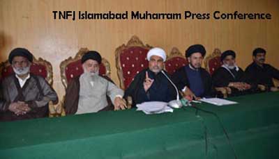 ISLAMABAD, October 16: TNFJ has demanded to Government that issue of azadari e imam e Hussain a.s since 1989 in occupied Kashmir should rise at international forums, ignorer of human rights and killer of hundreds of thousand kashmiries INDIA who has been made member of security council is equal to put humanity in front of a wolf. A notification for problems of Azadaran should be float by interior ministry at priority basis, National Action Plan is the guarantee of peace at some places lower level own wills and self made ban ships are creating mistrust. Govt should appoint focal person in Interior ministry and provincial home departments regarding Moharram ul harram issues. Every single young or old will follow the code of Azadari announced by Quaid-i-Millat Jafariya Agha Syed Hamid Ali Shah. Brotherhood between shia and sunnis in Majalis e aza and processions is really apprciatable. Monitoring on banned groups should more tight as these groups are working in sensitive area by changing their names which is horrible. Entrance ban ship in some cities at late Ulma e Karam is poor management by administration. Govt get rid of black sheeps which cause infamy. No interference or any other un constitutional hurdle will never be entertained in observing the Azadari of Imam Mazloom (A.S.) said by Allama Raja Basharat Imami (president federal area Islamabad TNFJ) and Allama Abu ul Hussain Zahid Kazmi (Nazam ul amoor Gilgit/Baltistan) in a joint press conference at national press club Islamabad. TNFJs leaders said not only in Pakistan but globally Majalis e aza and processions has been started which will be continued till 8th Rabi ul awal with all of its brilliancy and respect. In whole world not only muslims but every conscious human being is busy in mourning activities of grandson of Prophet and beloved son of BiBi Fatima a.s and Imam e Ali a.s who sacrificed himself along his 72 beloved followers and loyalists which is an example of practical in detail of dream of Hazrat Ibrahim a.s This sacrifice there it became a security of Islamic and human values where it fulfill that sense of passion, energy, bravery and power in victims of every world that even after passing 14 hundred years every victim is gaining passion and bravery from karbala and facing the cruels. This is the reason that today cruels and terrorists are afraid of zikar e Hussain a.s because zikar e Hussain a.s is the power of weaks and morale of victims. Today every human being is thankful of Imam Hussain a.s Every muslim proud of Imam e Hussain a.s Every Prophet lover loves Hussain a.s because love with Hussain a.s is the evidence of love with Allah and Prophet Muhammad s.w Allam Raja Bisharat Imami said to journalists that TNFJ Moharram committees control room has been established in Qasar e Khadija tul Kubra where responsible other than him are Allama Ikhlaq Kazmi, Zulfiqar Ali Raja, Allama Guftaar sadqi, Prof Ghulam Abbas Haidri, Allama Fakhar Abbas Haidri included. Although Islamabad administration is completely in contact with us but still from federal govt has not established the notification of moharram control room for the better treatment and solutions of azadaran e Imam e mazloom, announcement of telephone numbers will not be enough there must be appointments of responsible which should connected with TNFJs moharram committee azadari cell. its often observed that a lower management level of staff is appointed on these contact number who do not have authority to take any decision or to order below staff in case of any emergency. They paid tribute to martyred and wounded security forces personals who took part in twin city Rawalpindi operation and demand administration to continue the search operation against terrorists. Allama Abu ul Hussain Zahid Kazmi (Nazam ul amoor Gilgit/Baltistan) said that Gilgit/Baltistan is a sensitive territory whichs sensitivity has accelerated due to pak china economic corridor that is why it is not digesting to all anti Pakistan powers including aeonion enemy India. It is our demand there special arrangements should placed in Gilgit/Balitistan particularly no lenient attitude provide to banned groups which still working there today with new names. He said Kahmiri people has to face bloodshed and Tyrannizes on azadari activities we demand to govt of Pakistan to rise the voice all around the world against Indian acts of stopping azadari activities of Kashmiri victimized people and bare the Indian wronged acts. TNFJs leaders recalled the promise that all shia sunni schools of thought will observe the Gham-e-Hussain jointly during the month of Muharram ul Haram will rise the word of Haq against every dictator and unfair powers by getting the lesson from inconsumable sacrifice of imam e mazloom a.s. On this occasion there was prayer called for harmony of souls of martyred of journalism who followed the path of Hussainiat a.s