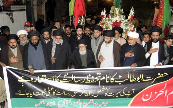 The Quaid-i-MillatJafariya Agha Syed Hamid Ali Moosavi said that Hazrat Abu Talib (A.S.) protected the Rasool-e-Khuda (SAAW) throughout his life. He not only brought the Rasool (SAAW) up but remained the defender of the Rasool-e-Khuda throughout his life and bore all types of difficulties but did not let anybody cause any harm to the personality of the Mustafa (SAAW). That is why he declared the year of Wisal of Hazrat Abu Talib (A.S.) and Hazrat Khadijatul Kubra (S.A.) as Aam Al-Huzn as a result of which the Rasool (SAAW) had to leave Makkah as there was no protector of him there anymore. He said the religion of Islam will always be thankful for Hazrat Abu Talibs blessings. Meanwhile, dozens of MatmiDastas, a large number of ulema, elite from religious organisations and thousands of Azadaran participated in the procession and paid pursa to the Hazoor-e-Akram (SAAW).